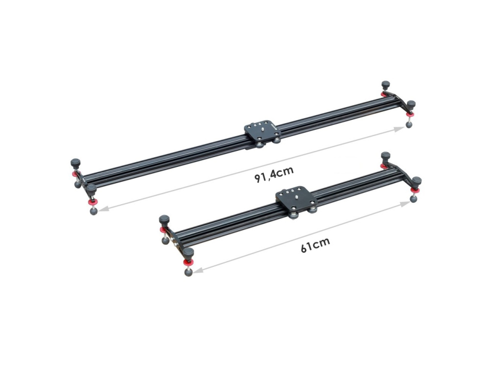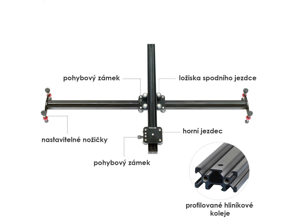 | Možnosti využití Dolní část slideru lze využit samostatně díky nastavitelným nožičkám, což umožňuje využití slider klasickým způsobem. Při použití sestavy na stativu jsou obě dráhy pojezdu plně funkční, na rozdíl od toho, když sestavu používáte na zemi či stole. |
