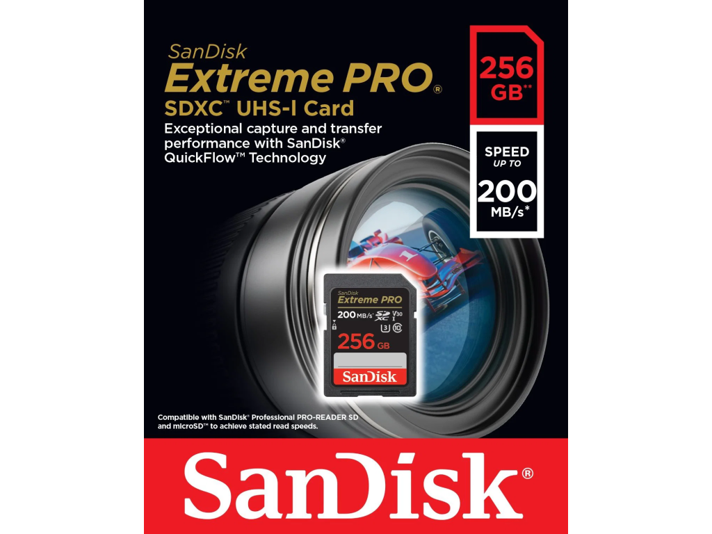 SanDisk Extreme PRO SDXC UHS-I karta 256GB Zvládne i 400Mb/s All-Intra video - čtení až 200 MB/s, snímání až 140 MB/s, třída U3 / V30 pro 4K UHD záznam