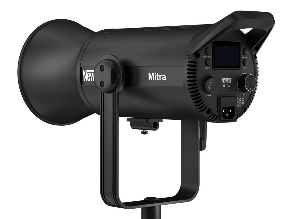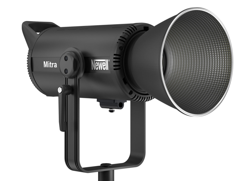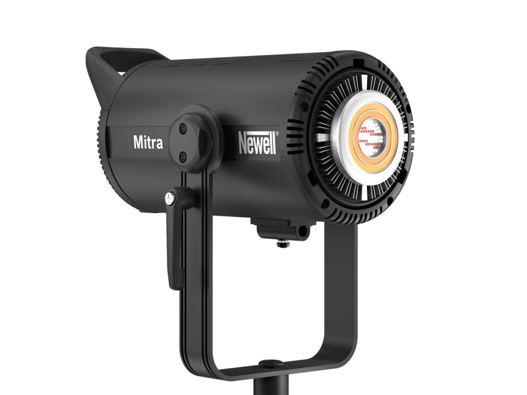 Lampa Newell RGB Mitra jest wyposażona w popularny uchwyt Bowens. Zapewnia szeroką kompatybilność z różnymi typami modyfikatorów używanych w filmie i fotografii. Dzięki uchwytowi można przymocować lampę do dołączonego klosza lub innych akcesoriów, takich jak wrota, softboxy lub streamery.