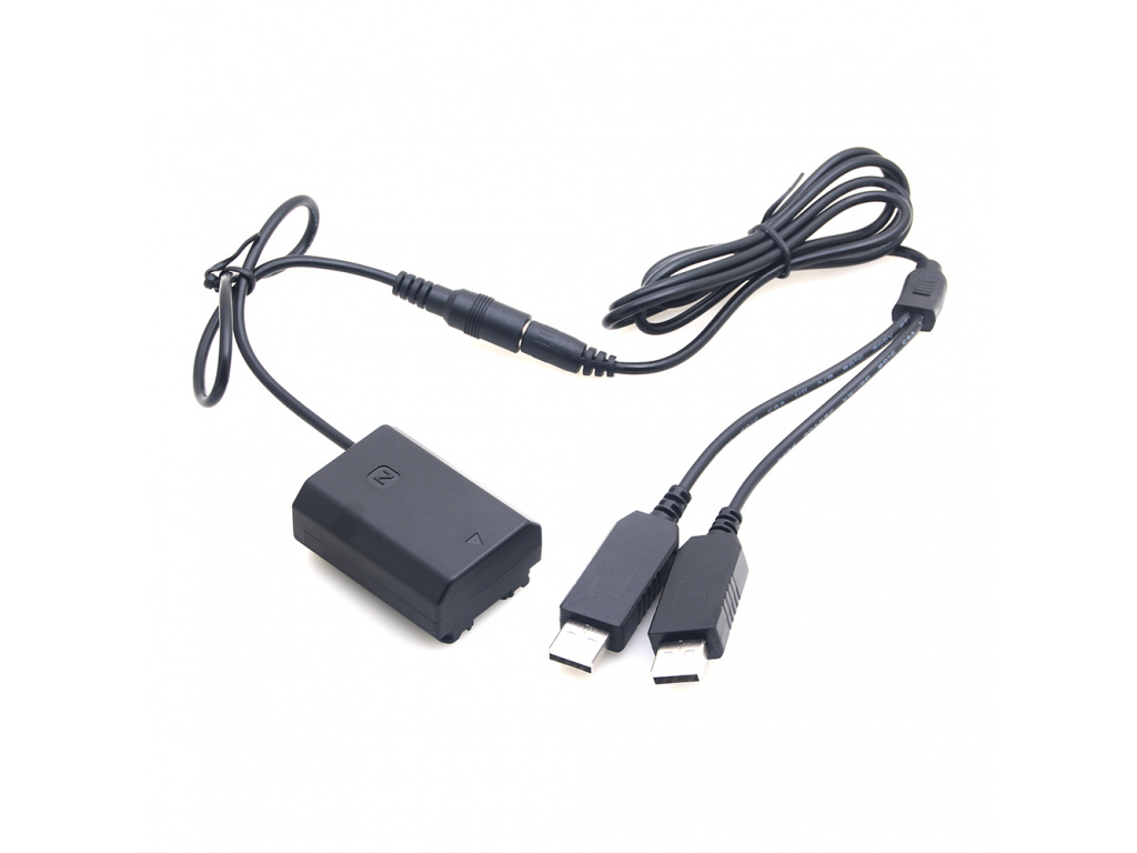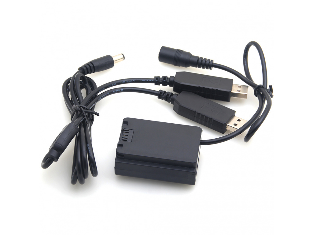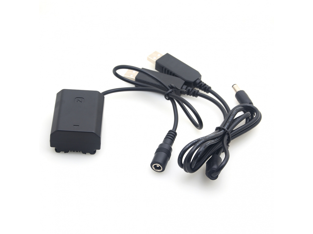 Bateria Dummy służy do tzw. niekończącego się zasilania kamer. Wystarczy włożyć baterię Dummy do komory kamery zamiast standardowej baterii do ponownego ładowania, a drugi koniec można podłączyć do akumulatora lub urządzenia ze złączem USB. Szybki i bezpieczny sposób zasilania kamery bez baterii.