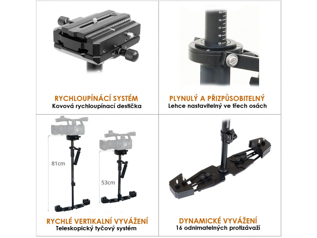 BARDZO PROSTA OBSŁUGA Cały zestaw został zaprojektowany tak, aby pomóc użytkownikowi lepiej kontrolować sytuację i jak najbardziej zredukować wysiłek. Wszystko dzięki jednemu ramieniu stabilizującemu i profesjonalnemu steadicamowi. |
