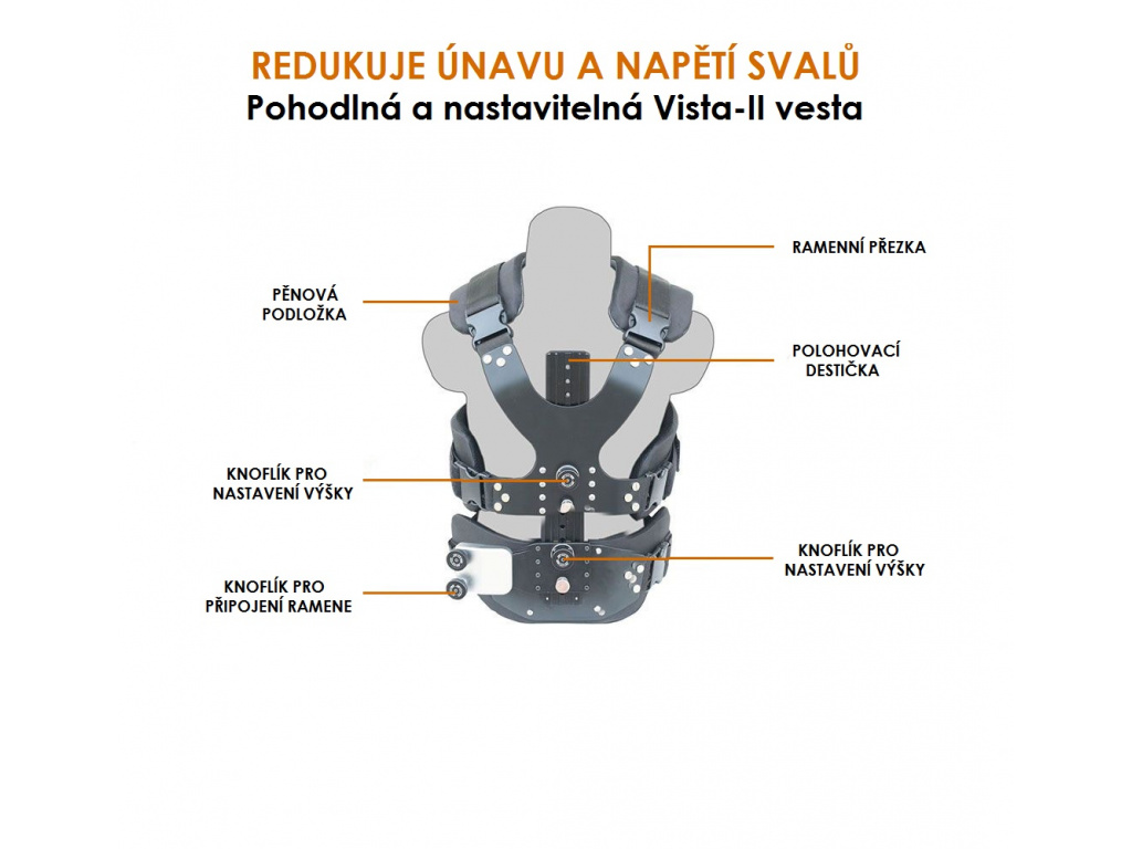 Kamizelka Vista II jest przystosowana do szerokiej gamy użytkowników. Wysokiej jakości piankowe podkładki gwarantują komfort nawet podczas długotrwałego filmowania. Wysokiej jakości klamry i precyzyjne połączenia gwarantują całkowite bezpieczeństwo. Łatwo dopasowuje się do niemal każdej sylwetki dzięki regulowanej płytce piersiowej. Założenie i ustawienie nowego systemu stabilizacji zajmuje tylko kilka minut.
