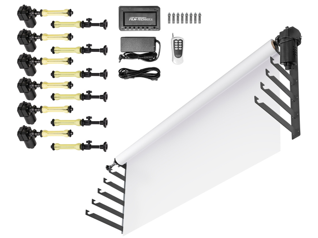 Ten zmotoryzowany elektryczny zestaw do napędu tła może obsłużyć 6 rolek papieru lub tkaniny tła. Całą konstrukcję można łatwo zamocować na statywach lub przymocować do ściany lub sufitu. Pilot zdalnego sterowania jest funkcjonalny w zakresie 15 m, więc nie musisz ręcznie za każdym razem podchodzić do zmiany tła, zmotoryzowane walce zrobią to sprawnie i ostrożnie za Ciebie.