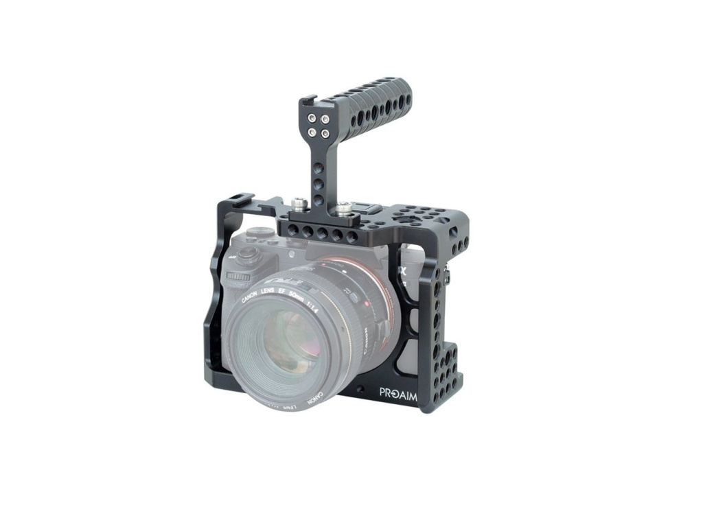 Proaim prezentuje własny projekt klatki dla A7R III z górnym uchwytem, który zapewnia bezpieczeństwo i wygodę podczas noszenia lub filmowania. Górny uchwyt oferuje wiele punktów montażowych do mocowania zewnętrznych akcesoriów, nie brakuje również sanek. Klatka zapewnia swobodny dostęp do wszystkich ważnych funkcji a7R III, np.: przegródka na baterię, slot na karty SD lub złącza do podłączenia zewnętrznych monitorów czy mikrofonu. Zestaw zawiera również podstawę 15 mm, która umożliwia łatwe podłączenie matte boxu, bocznego ostrzenia lub poduszki naramiennej z obciążnikiem. Bonusem jest również regulowana wysokość adaptera z prętami 15 mm, co znacznie rozszerza zakres kompatybilnych akcesoriów. Spodnia część zawiera platformę do mocowania na statywie.