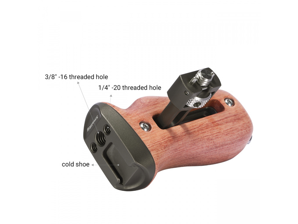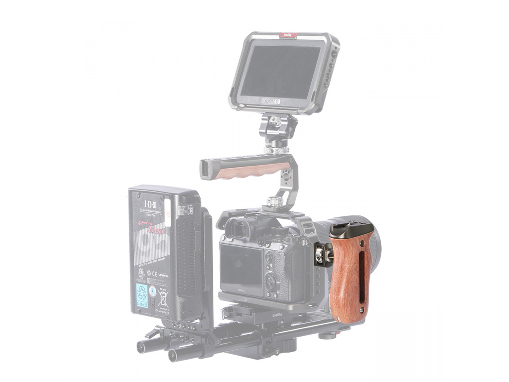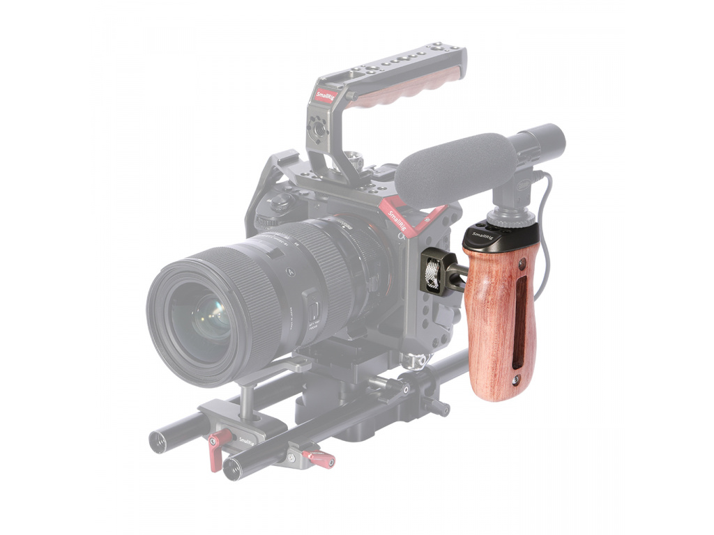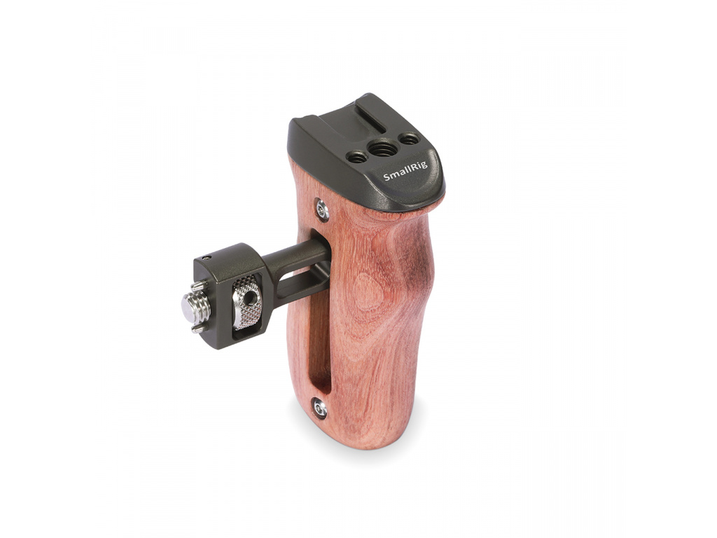 Uchwyt mocuje się do klatki lub zestawu kamery za pomocą śruby ARRI 3/8"-16 z dwoma kołkami prowadzącymi. Uchwyt można skonfigurować dla prawej lub lewej ręki, odłączając metalowe złącze. Dzięki 3/8"-16, 1/4"-20 i sankom można dodać ramię przegubowe, światła, mikrofon lub inne akcesoria. Śruby mocują się do mechanizmu ślizgowego, który umożliwia przesuwanie uchwytu w górę i w dół do preferowanej pozycji. Zintegrowany klucz imbusowy w dolnej części umożliwia regulację położenia uchwytu i zwiększenie bezpieczeństwa. Uchwyt z gładkiego drewna zapewnia pewny i wygodny chwyt oraz dobrze sprawdza się również w niskich temperaturach.