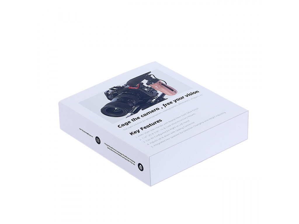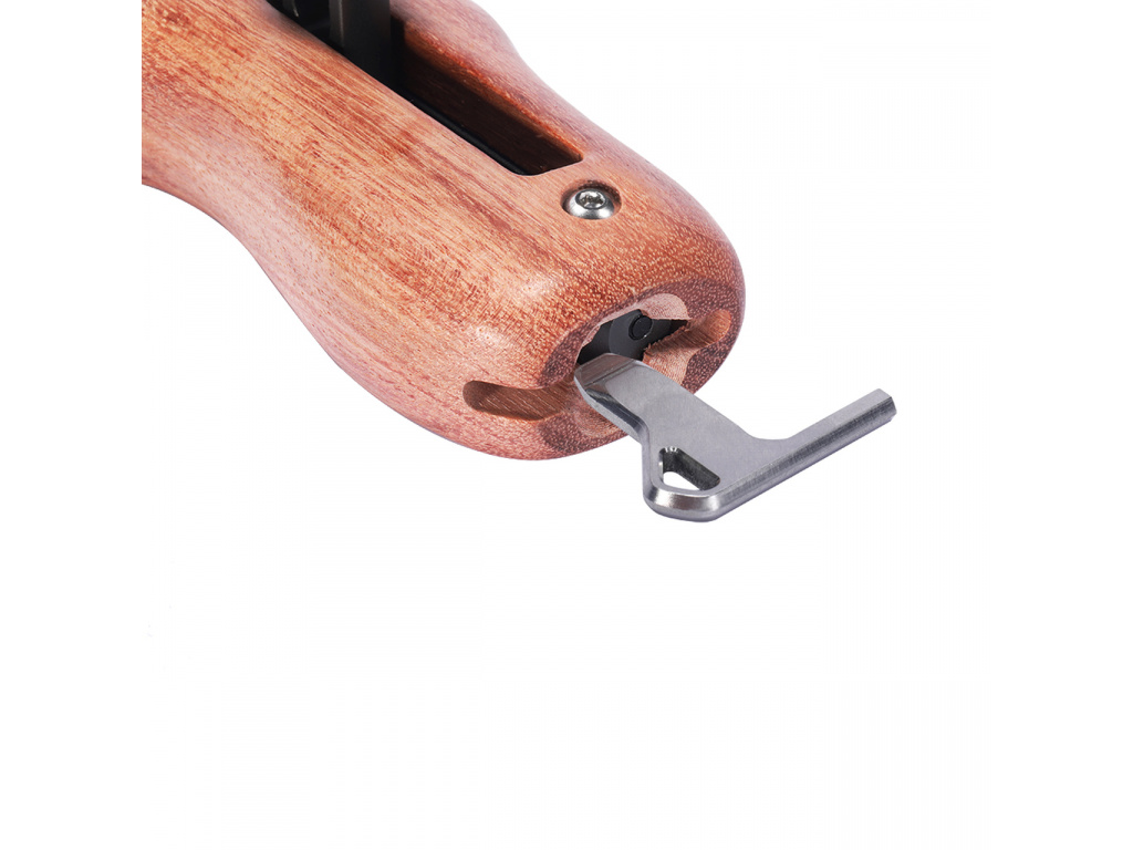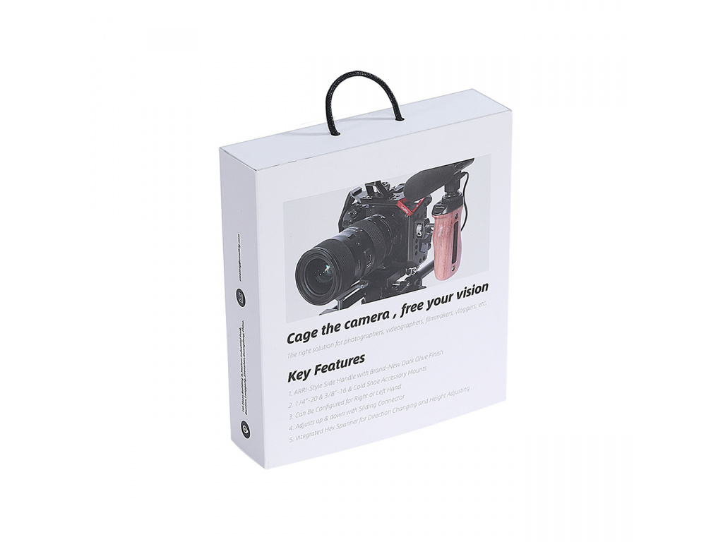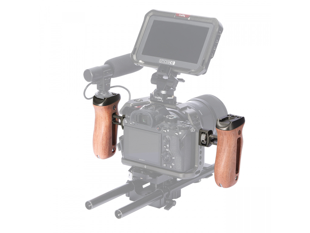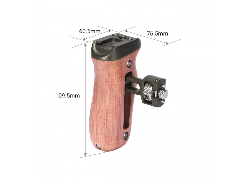 Uchwyt mocuje się do klatki lub zestawu kamery za pomocą śruby ARRI 3/8"-16 z dwoma kołkami prowadzącymi. Uchwyt można skonfigurować dla prawej lub lewej ręki, odłączając metalowe złącze. Dzięki 3/8"-16, 1/4"-20 i sankom można dodać ramię przegubowe, światła, mikrofon lub inne akcesoria. Śruby mocują się do mechanizmu ślizgowego, który umożliwia przesuwanie uchwytu w górę i w dół do preferowanej pozycji. Zintegrowany klucz imbusowy w dolnej części umożliwia regulację położenia uchwytu i zwiększenie bezpieczeństwa. Uchwyt z gładkiego drewna zapewnia pewny i wygodny chwyt oraz dobrze sprawdza się również w niskich temperaturach.