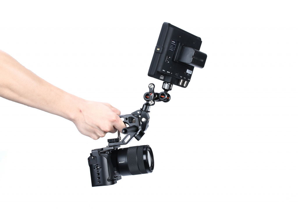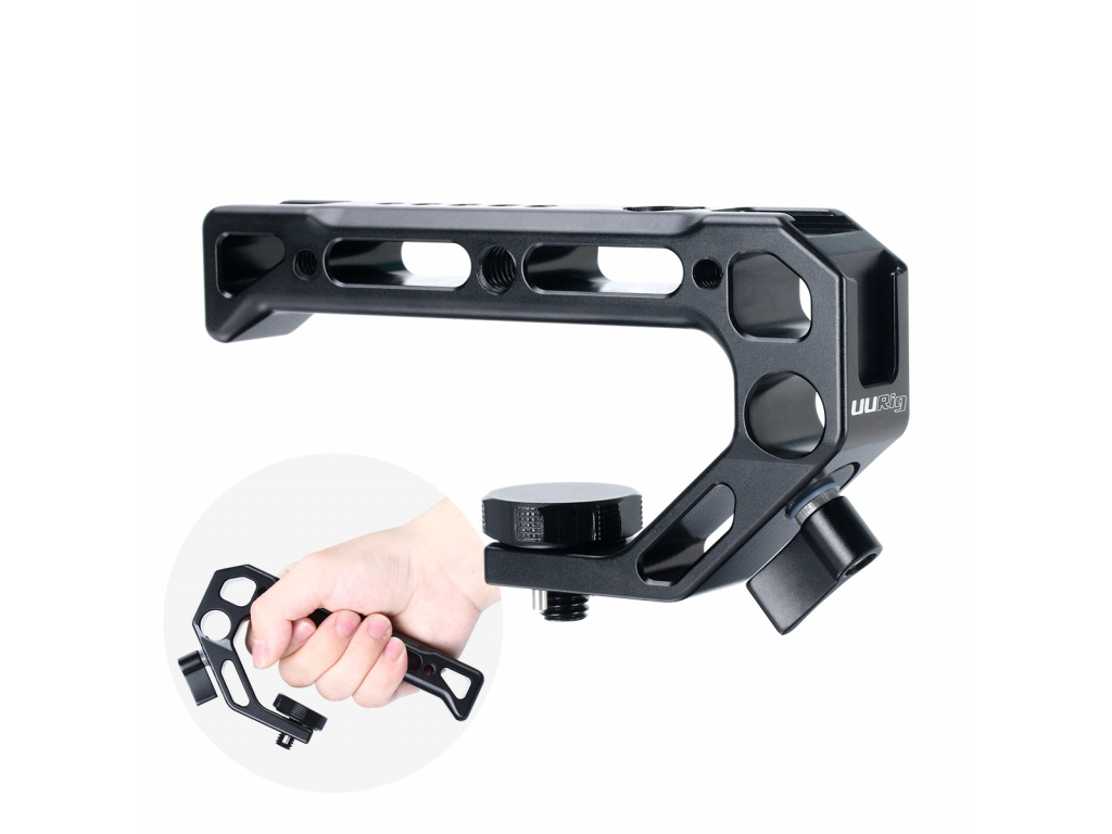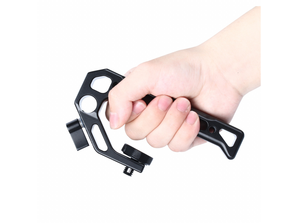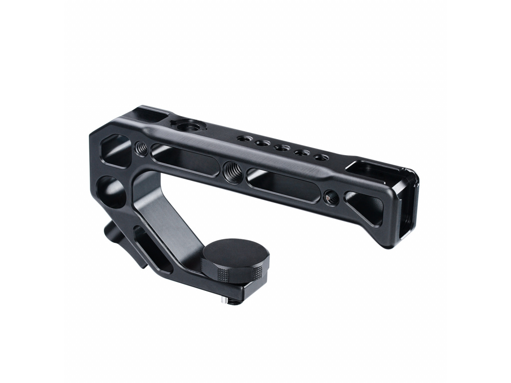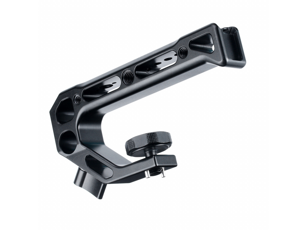 Uniwersalny górny uchwyt do klatek operatorskich. Uchwyt mocuje się do klasycznego gwintu 1/4". Uchwyt oferuje szereg możliwości podłączenia zewnętrznych akcesoriów: do sanek z przodu i z tyłu, gwintów 1/4" i 3/8" oraz gwintu lokalizacyjnego ARRI, a nawet otwór na pręt 15. Uchwyt jest wygodny i przyjemny w dotyku, idealny do tzw. ujęć z podłogi.