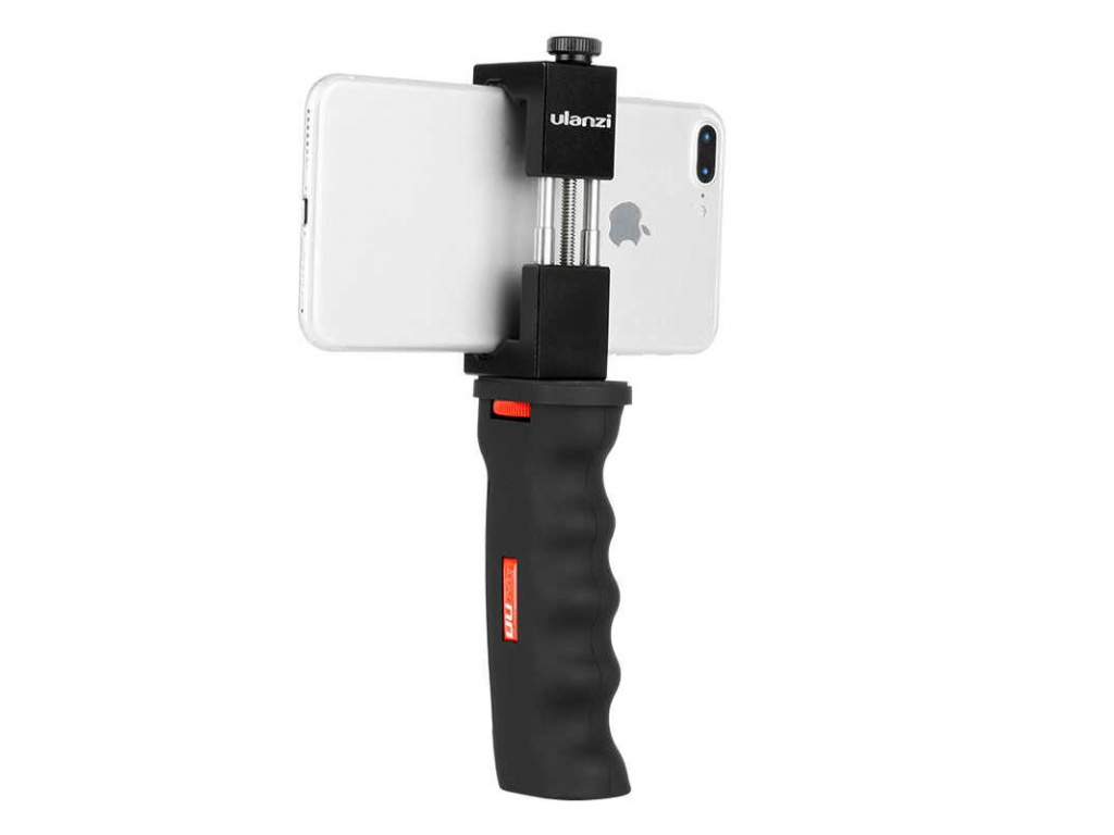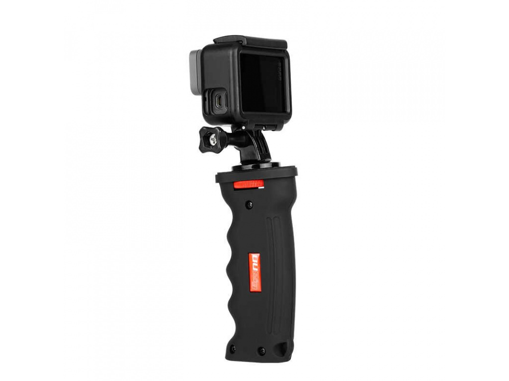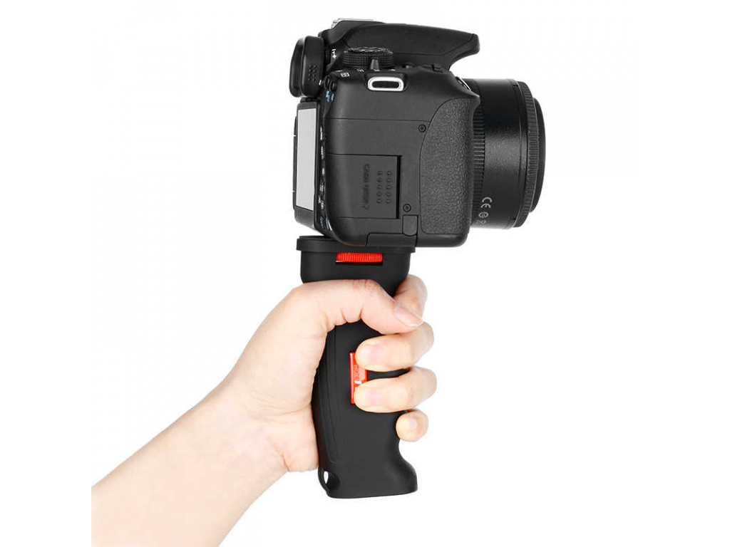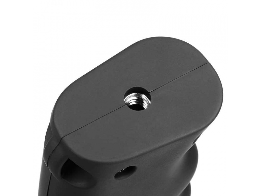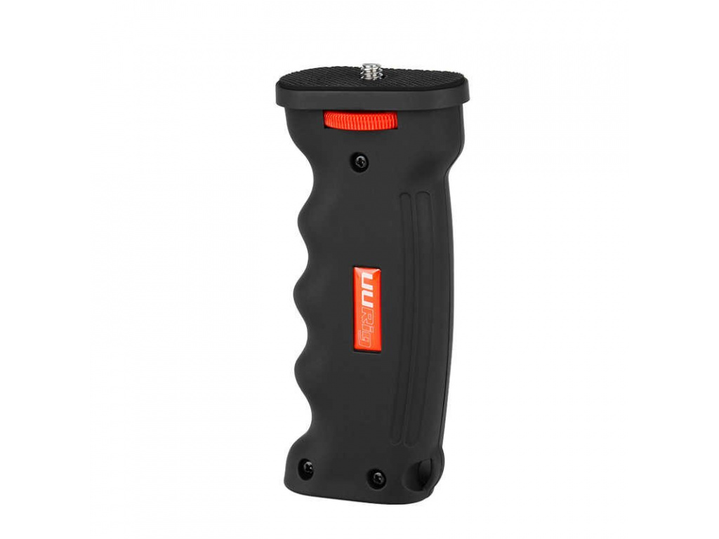 Uchwyt PROAIM z gwintem 1/4" (męski) i gwintem blokującym 1/4" (żeński) na spodzie. Idealny jako uchwyt do vlogowania, grip do mocowania telefonu komórkowego, kamery sportowej, klasycznej kamery, a nawet gimbala. Rękojeść jest plastikowa i blokuje się za pomocą czerwonego pokrętła. Przednia strona rękojeści jest ukształtowana tak, aby dobrze pasowała do dłoni.