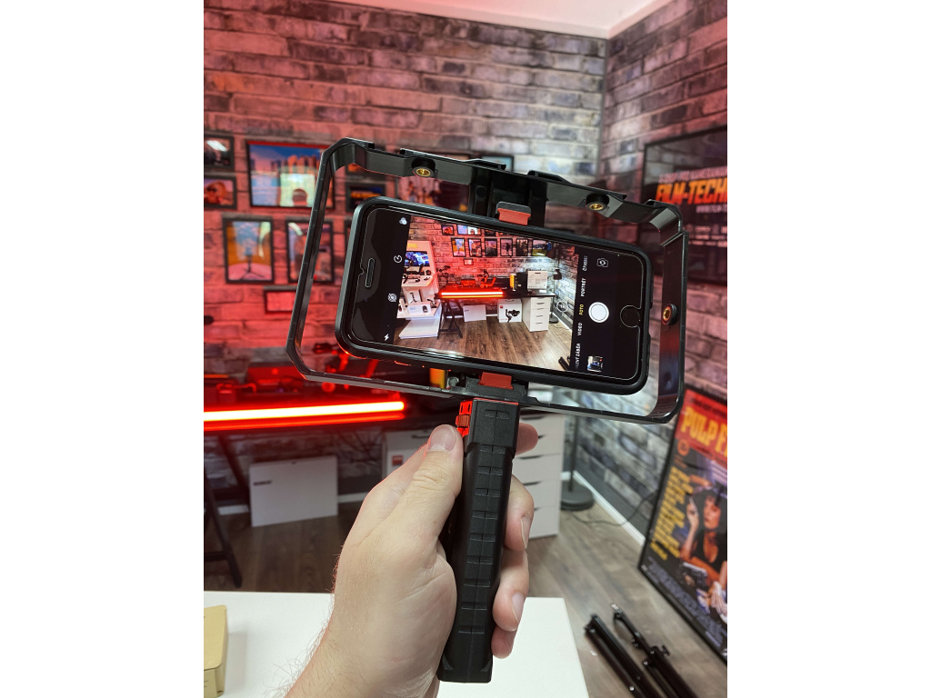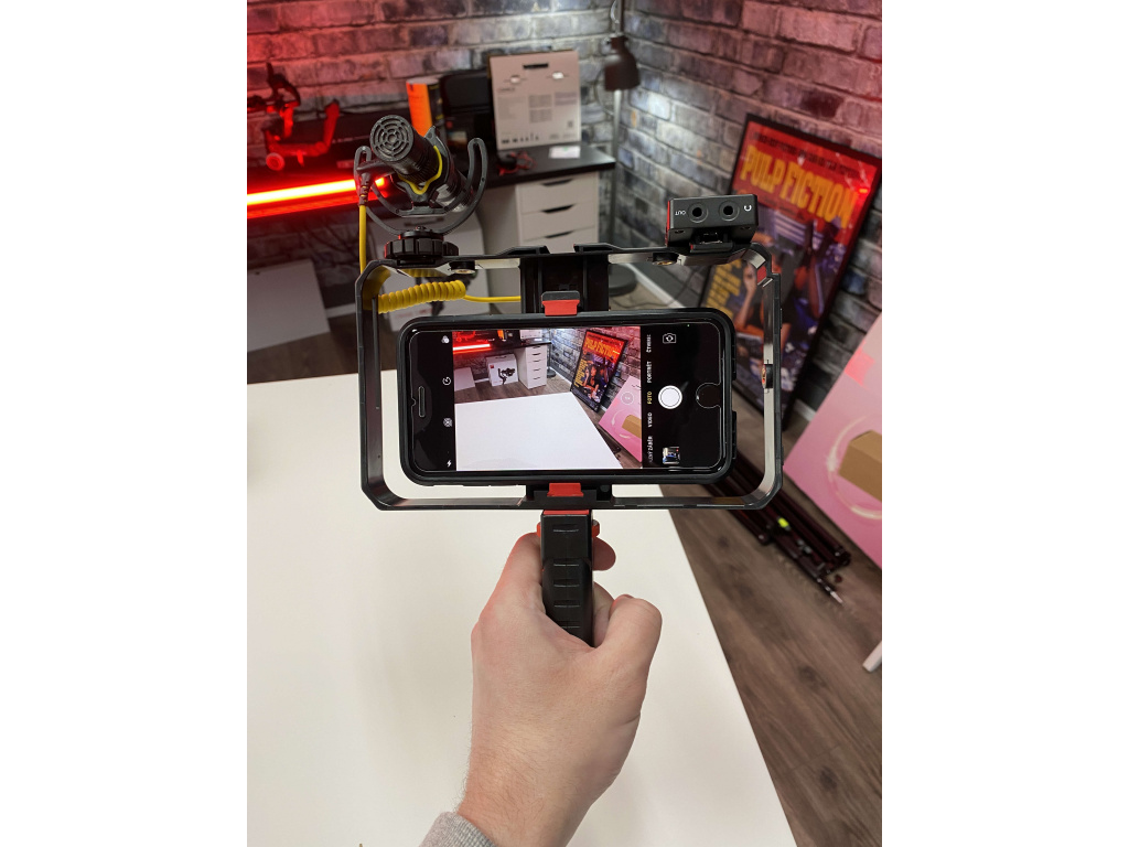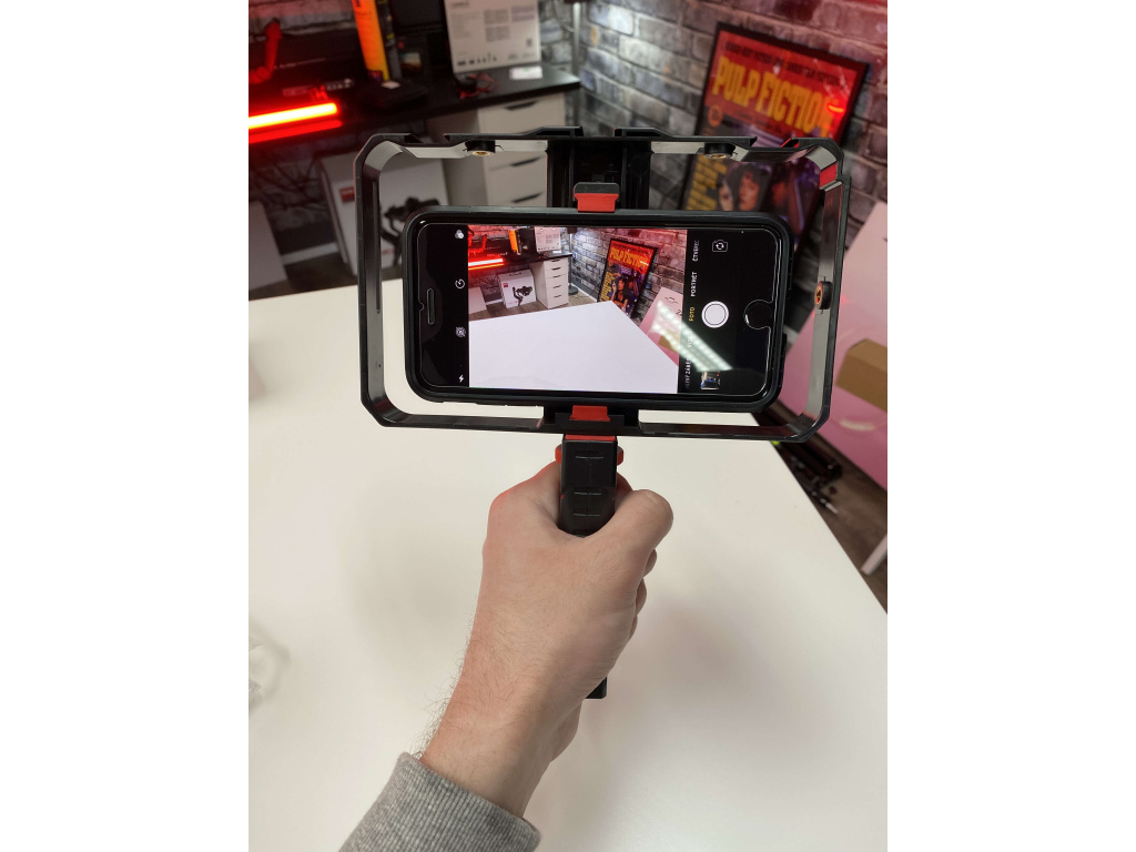 Świetna klatka na smartfony ze zdejmowanym uchwytem. Można go używać jako uchwytu bocznego lub bezpośrednio jako uchwytu pod klatką. Do klatki włożyliśmy iPhone 8 Plus w bardzo solidnej obudowie / etui.