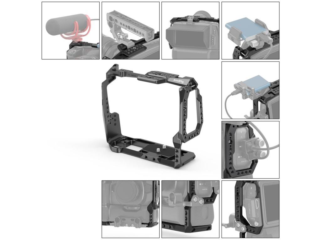 Utrzymuje pełny dostęp do elementów sterujących i portów aparatu, a także zapewnia dostęp do baterii. Klatka ta zawiera kilka gwintów 1/4"-20 i 3/8"-16, mocowanie zapobiegające skręcaniu w stylu ARRI, dwa rowki NATO i trzy sanie do mocowania dodatkowych akcesoriów. Można na przykład podłączyć SmallRig NATO Top Handle HTN2439 lub NATO Side Handle HSN2270. Można również zamontować monitor za pomocą MagicRig Ball Head Magic Arm 2070 lub 2115. Klatka ta jest również kompatybilna z SmallRig SSD Holder 2245B, Cable Clamp 2246B, HDMI & USB-C Right-Angle Adaptor AAA2700 i Sun Hood VH2299. Ponadto można przymocować również SmallRig 15mm Dual Rod Clamp 1943 do Matte Box lub follow focus. Klatka posiada również otwory na paski na szyję.