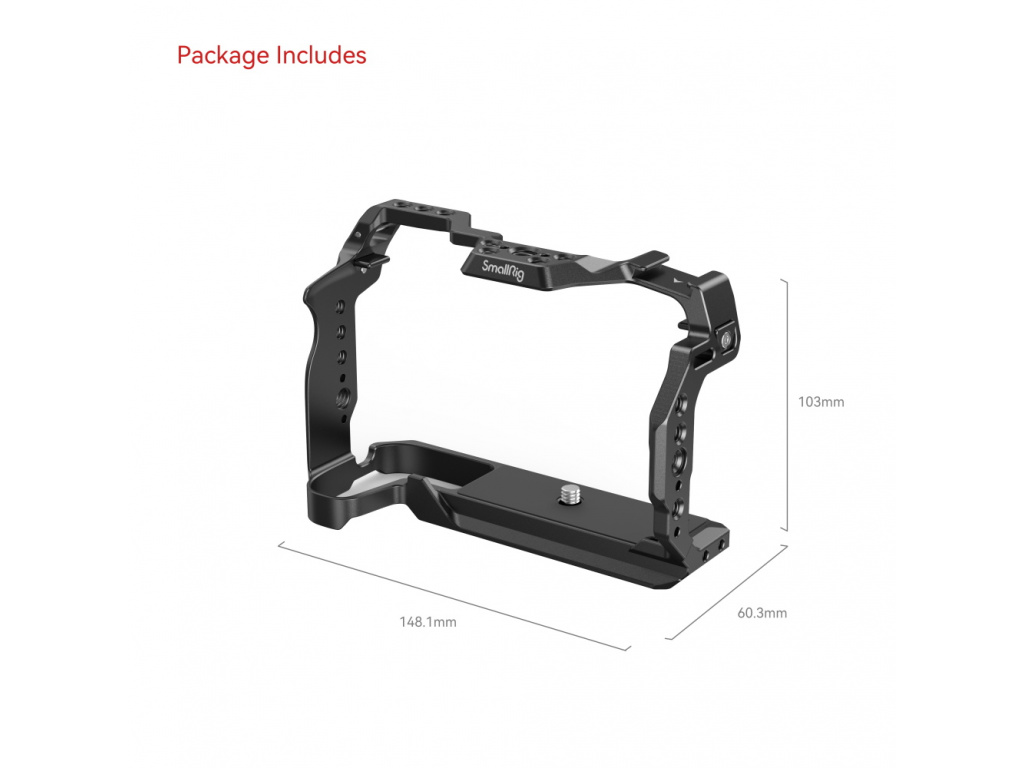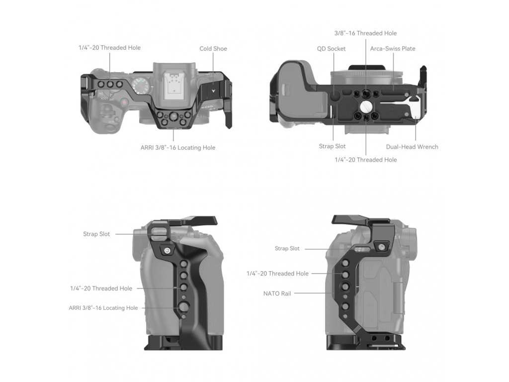 Klatka SmallRig do Canon EOS R8 4212 jest przeznaczona do ochrony aparatu i mocowania akcesoriów. Blokowanie aparatu za pomocą jednej dolnej śruby 1/4 "-20 i dwóch adapterów blokady bocznej, klatka jest dostarczana z gumowymi podkładkami, które zapobiegają zarysowaniom i umożliwiają pełny dostęp do przycisków, gniazd kart, obrotowego ekranu i drzwiczek baterii. Wśród mocowań akcesoriów znajdują się otwory gwintowane 1/4"-20, otwory gwintowane 3/8"-16 i osiowe otwory ARRI 3/8"-16. Dostępne jest również gniazdo QD do szybkozłączki paska na ramię i dolna szybkozłączka Arca-Swiss do statywu typu Arca lub DJI RS 2 / RSC 2 / RS 3 / RS 3 / RS 3 Pro do szybkiego przełączania między nagrywaniem z gimbala, z ręki i ze statywu. W zestawie znajduje się śrubokręt ułatwiający montaż i demontaż.