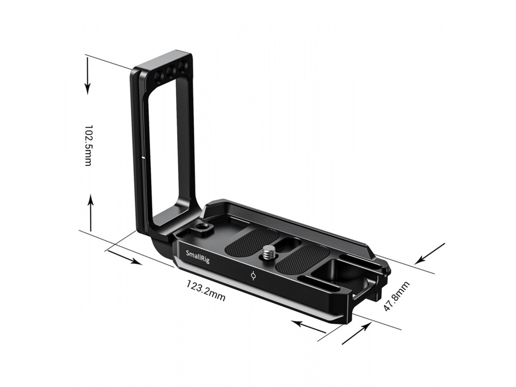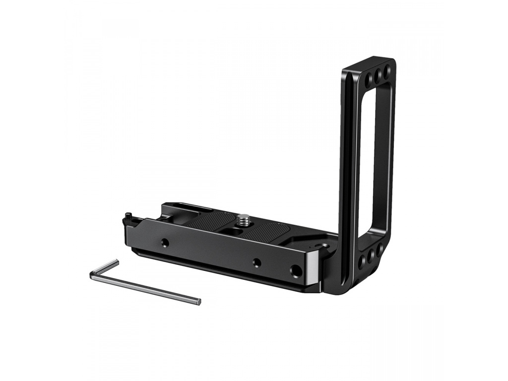 SmallRig L-Bracket do Panasonic Lumix DC-S1 i S1R APL2354 to modułowa konstrukcja z kołnierzami zapobiegającymi skręcaniu, aby zapobiec skręcaniu się kamery i zapewnić gwinty montażowe dla akcesoriów. Zarówno płyta podstawowa, jak i płyta boczna są kompatybilne z typem Arca i umożliwiają mocowanie kamery w pozycji pionowej lub poziomej. Każda oś ma linię środkową czujnika do wyrównywania aparatu na głowicy statywu. Zabezpiecza spód aparatu za pomocą śruby 1/4”-20 i jest wyposażony w kołek prowadzący, który zapobiega skręcaniu. Płyta L ma z boku i na dole kilka otworów z gwintem 1/4"-20 do mocowania akcesoriów, takich jak Cold Shoe 1593 i Manfrotto QR Plate 1280. Płytę boczną można rozszerzyć o 30 mm, jeśli potrzeba więcej miejsca do mocowania lub odłączania kabla. Dodatkowo, spód zawiera otwór na pasek Peak Design, a płaski śrubokręt umożliwia zainstalowanie klatki L w ciągu kilku sekund.