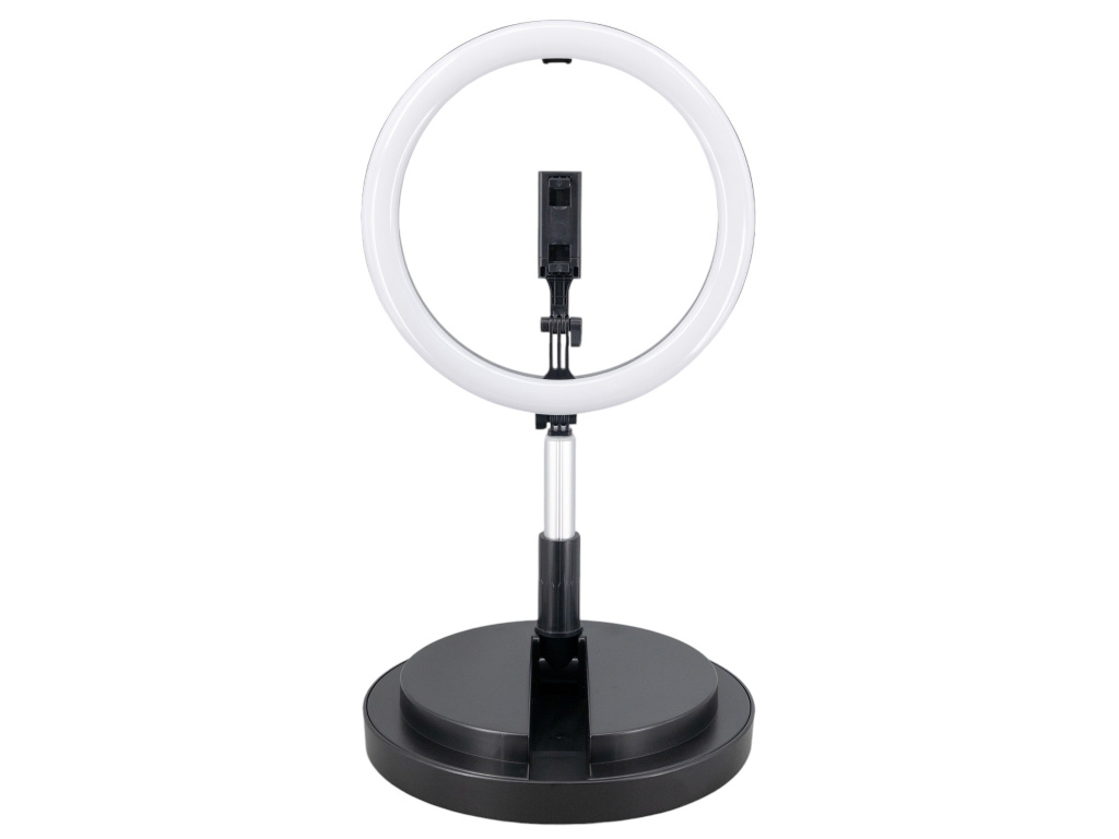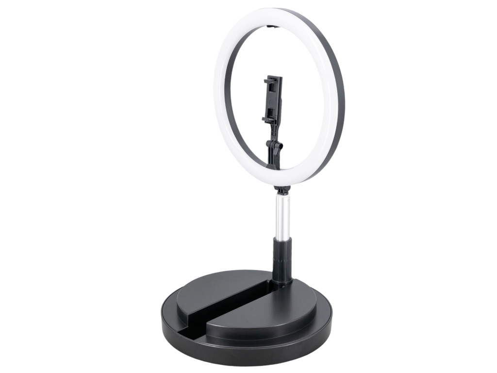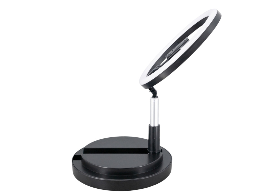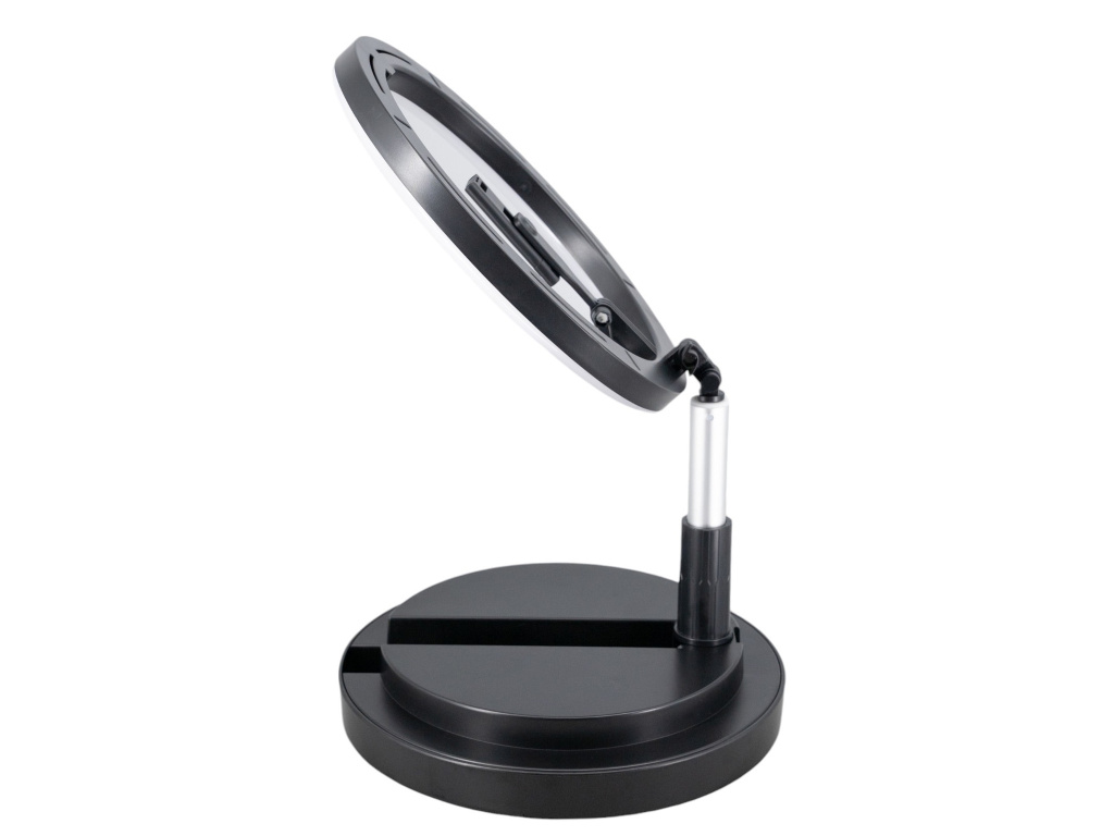 Mała, ale bardzo wydajna lampa pierścieniowa ring light 8" z lusterkiem, uchwytem na telefon komórkowy i metalową podstawką na stół.
