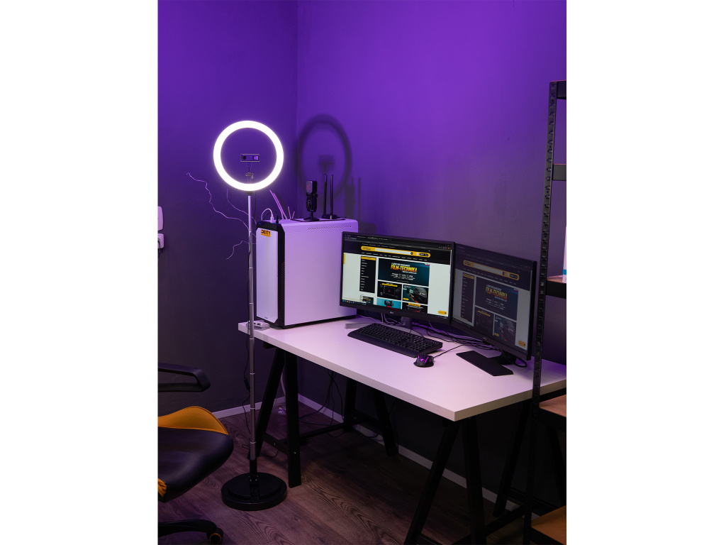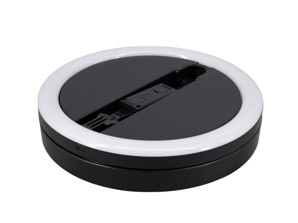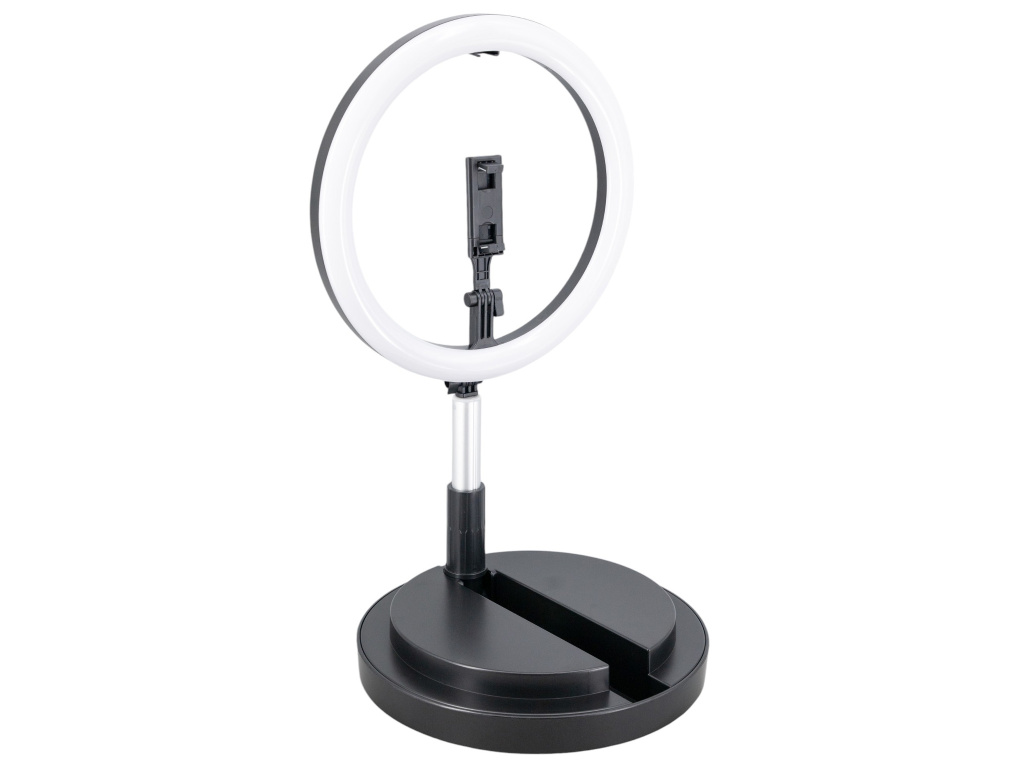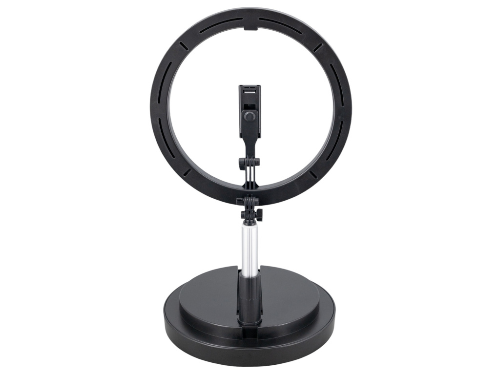 Mała, ale bardzo wydajna lampa pierścieniowa ring light 8" z lusterkiem, uchwytem na telefon komórkowy i metalową podstawką na stół.