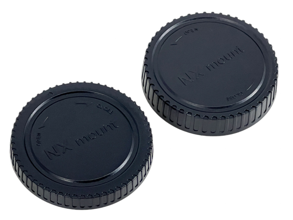 Ochronna osłona korpusu i tylna osłona obiektywów marki Samsung NX-mount. Zapasowa plastikowa osłona obiektywów. W zestawie znajduje się zawsze 1 sztuka przedniej i 1 sztuka tylnej osłony.
