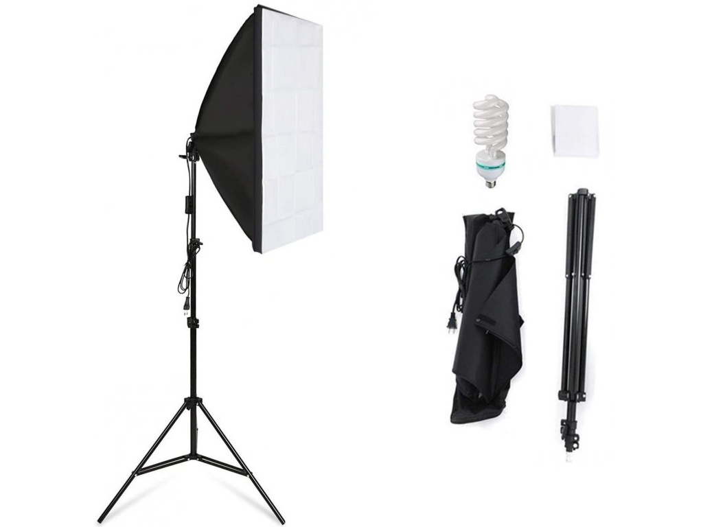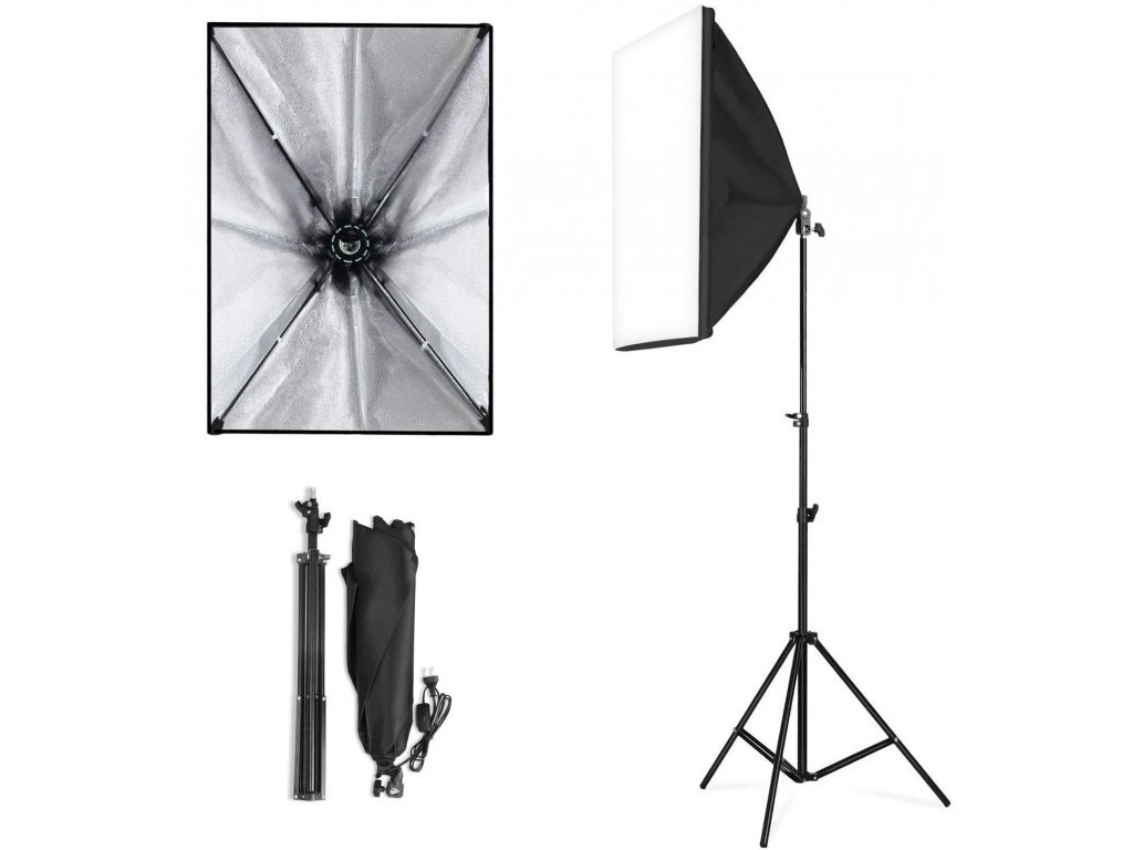 Bardzo wydajny softbox, który tworzy bardzo naturalne światło dzienne o temperaturze 5500K. Dostarczany jest z żarówką 135W i statywem. Softbox można nachylać w zakresie 21°, a wysokość aluminiowego statywu można regulować od 68 cm do 200 cm. Zaletą zestawu jest również aluminiowa konstrukcja, do której można przymocować płótna fotograficzne za pomocą czterech zacisków.