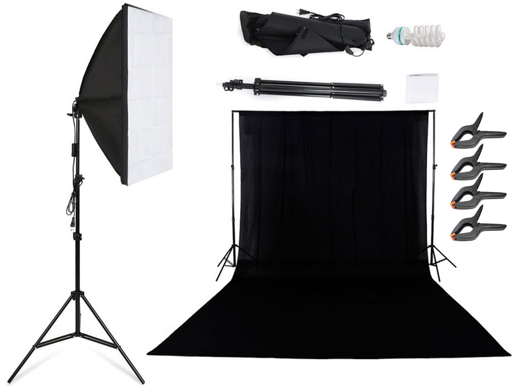 Zestaw studyjny Softbox 50x70 cm z żarówką 135W, czarne płótno, zaciski, konstrukcja aluminiowa