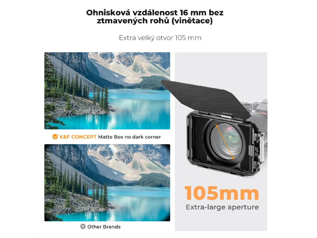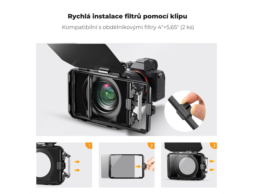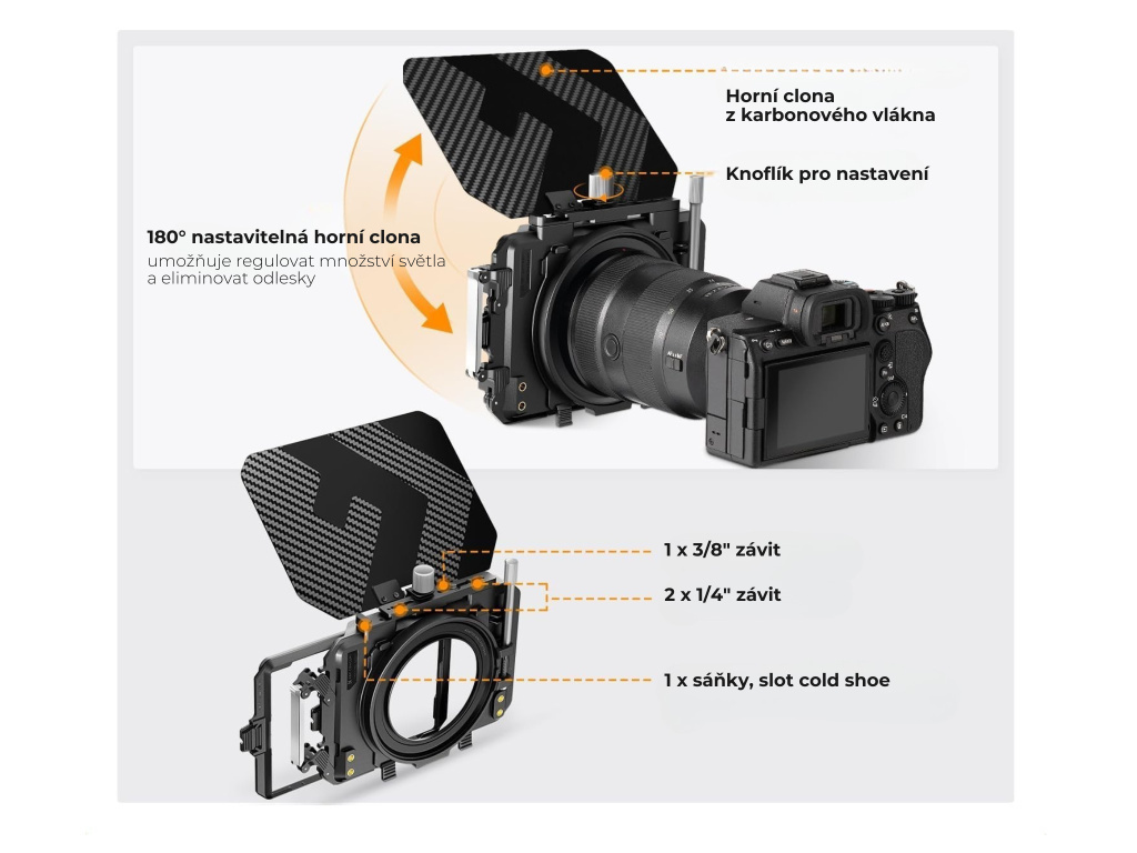 Ten lekki, wykonany z włókna węglowego matte box o matowym wykończeniu idealnie nadaje się do eliminacji "parazytniczego" światła i zapewnia ostre i wysoce kontrastowe zdjęcia. Pomimo grubości zaledwie 34 mm, został zaprojektowany tak, aby zapobiegać winietowaniu, nawet przy użyciu obiektywów szerokokątnych do 16 mm. Matte Box jest wyposażony w system mocowania dwóch filtrów 4x5,65" o grubości 4 mm, co gwarantuje elastyczność podczas pracy w różnych warunkach oświetleniowych. W zestawie znajduje się 5 adapterów (67/72/77/82/95 mm), które zapewniają szeroką kompatybilność z większością lustrzanek cyfrowych i obiektywów bezlusterkowych, a ponadto zawiera kilka rozszerzających gwintów (1/4", 3/8", cold shoe) do montażu dodatkowych akcesoriów. Produkt oferuje możliwość rozbudowy za pomocą bocznych i szynowych płytek oraz jest dostarczany z praktyczną torbą transportową dla łatwej obsługi i ochrony komponentów podczas filmowania w terenie.