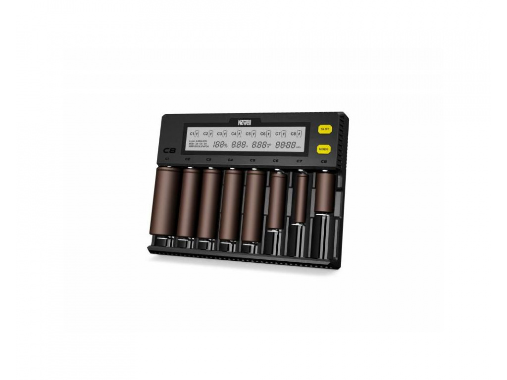 Newell C8 to uniwersalna, ośmiokanałowa ładowarka kompatybilna z większością dostępnych na rynku akumulatorów cylindrycznych. Wyświetlacz LCD pokazuje napięcie, prąd, czas ładowania, rezystancję wewnętrzną i stan naładowania ogniwa, co pozwala na łatwe monitorowanie procesu ładowania. Specjalnie zaprojektowana konstrukcja umożliwia ładowanie nawet największych akumulatorów cylindrycznych (typu C lub 22650) jednocześnie na wszystkich kanałach.