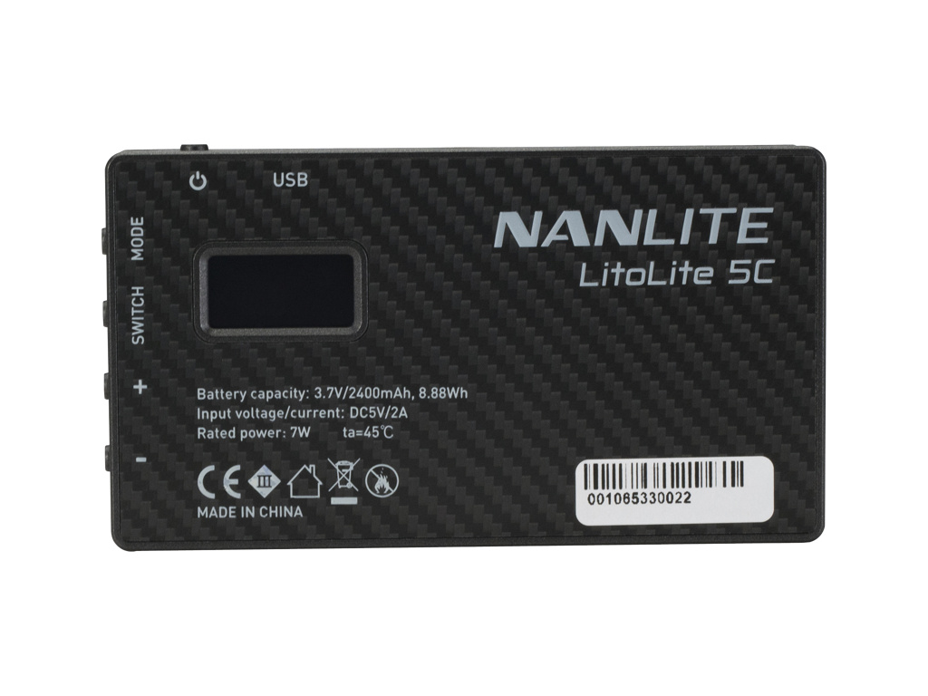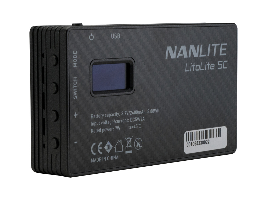 LitoLite 5C to kompaktowy panel świetlny LED z wbudowanym akumulatorem Li-Ion, ładowaniem przez USB-C, niesamowitą jasnością, regulowaną temperaturą barwową od 2700K do 7500K z przesunięciem kolorów od zielonego do purpurowego, sterowaniem odcieniem 360° ze 100 poziomami regulacji nasycenia kolorów i 15 wstępnie zaprogramowanymi, regulowanymi specjalnymi efektami świetlnymi.