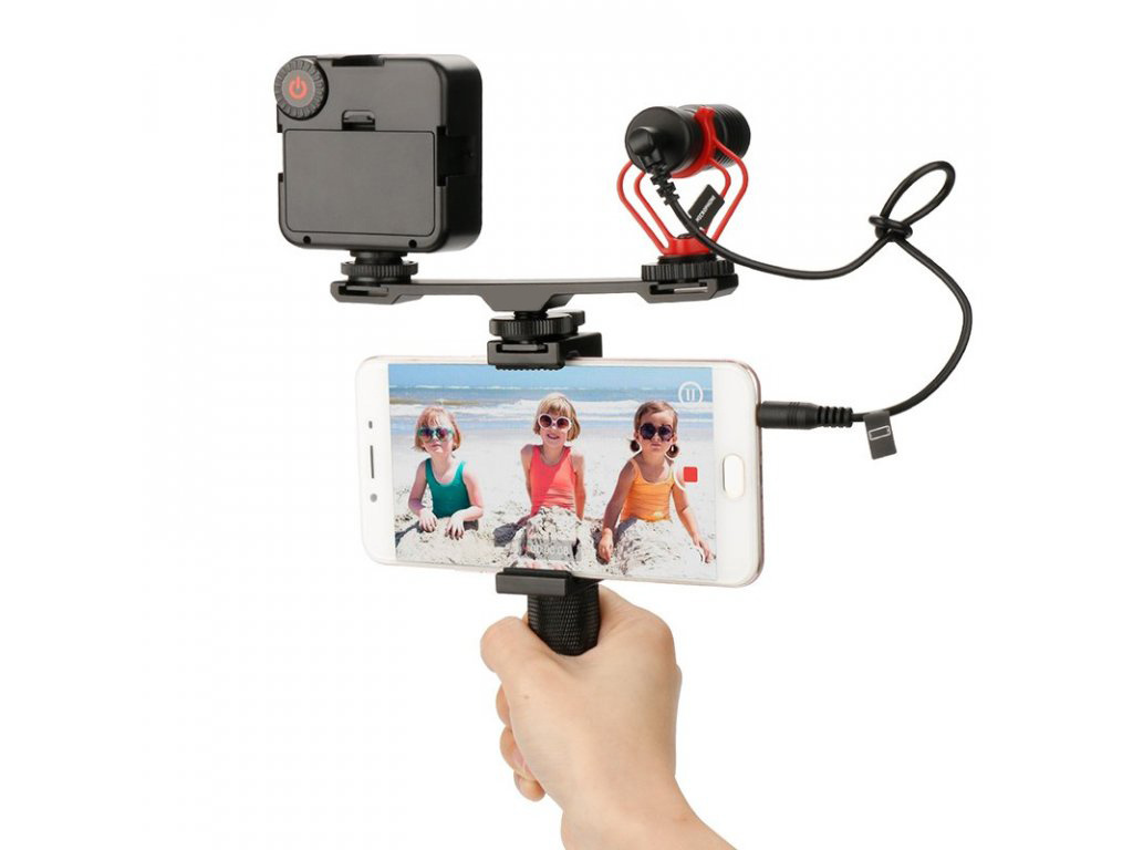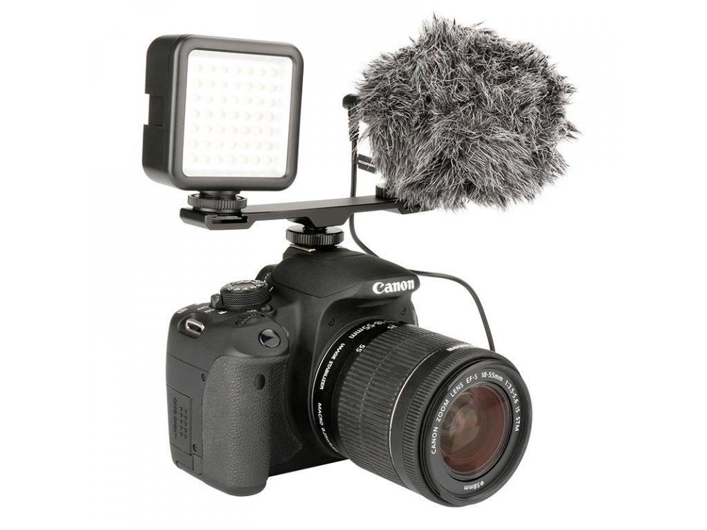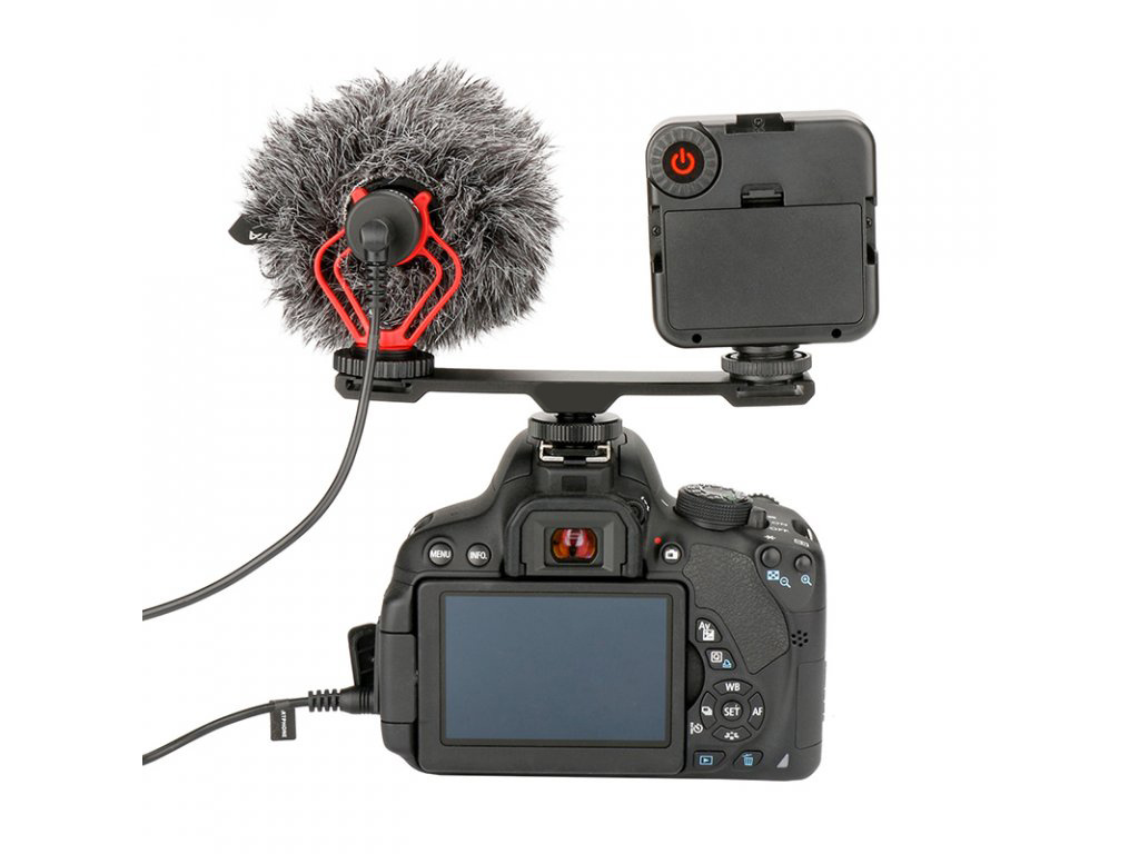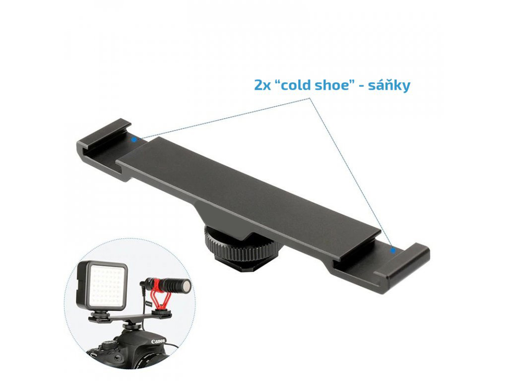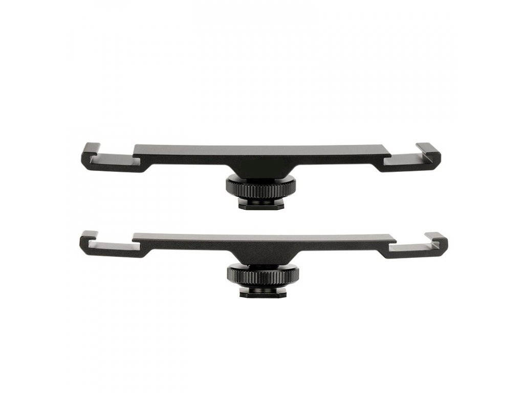 Uniwersalny uchwyt do różnych typów kamer, wyposażony w jedno mocowanie "hot shoe" - sanki (męskie), w tym gwint 1/4" i blokadę, oraz dwa mocowania "cold shoe" - sanki (żeńskie) do szybkiego i bezpiecznego montażu akcesoriów zewnętrznych, takich jak: mikrofon, światło LED, rejestrator audio i inne wyposażenie.