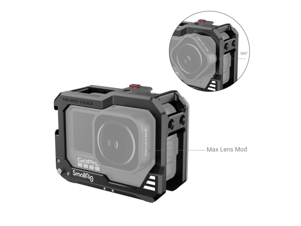 Klatka obsługuje wymianę obiektywu i jest kompatybilna z Max lens modem. Klatka jest zabezpieczana przez naciśnięcie obudowy i zwalniana przez naciśnięcie przycisku. Górna i prawa strona są wyposażone w dwie sanki, do których można podłączyć dodatkowe akcesoria, takie jak np. mikrofony i światła LED. Spodnia część zawiera składany uchwyt GoPro kompatybilny z oryginalną płytą bazową GoPro, a otwór z gwintem 1/4 można również bezpośrednio podłączyć do statywu. Boczny panel jest szybkozłączny. Możesz ładować kamerę przez port USB-C bez otwierania panelu. Zestaw zawiera adapter, który może być kompatybilny z oryginalnym adapterem do mikrofonu GoPro 7/8.