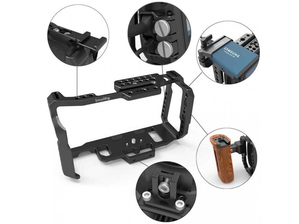 SmallRig klatka dla BlackMagic Design Pocket Cinema Camera 4K 2203. Kamerę mocuje się za pomocą dwóch śrub 1/4" w górnej i dolnej części. Boczna i górna strona zawiera rowek Nato, dzięki czemu można łatwo przymocować boczny uchwyt Nato 1955 lub drewniany uchwyt Nato 2187. Klatka zawiera szereg gwintów 1/4", 3/8" i ARRI location do mocowania różnego rodzaju akcesoriów. Użytkownikom dysku Samsung T5 SSD zalecamy dokupienie 2245, a do zabezpieczenia kabla najbardziej odpowiednia jest blokada SmallRig 2246. Podczas pracy z adapterem Metabones można dokupić wspornik SmallRig 2247 dla lepszej ochrony obiektywu.
