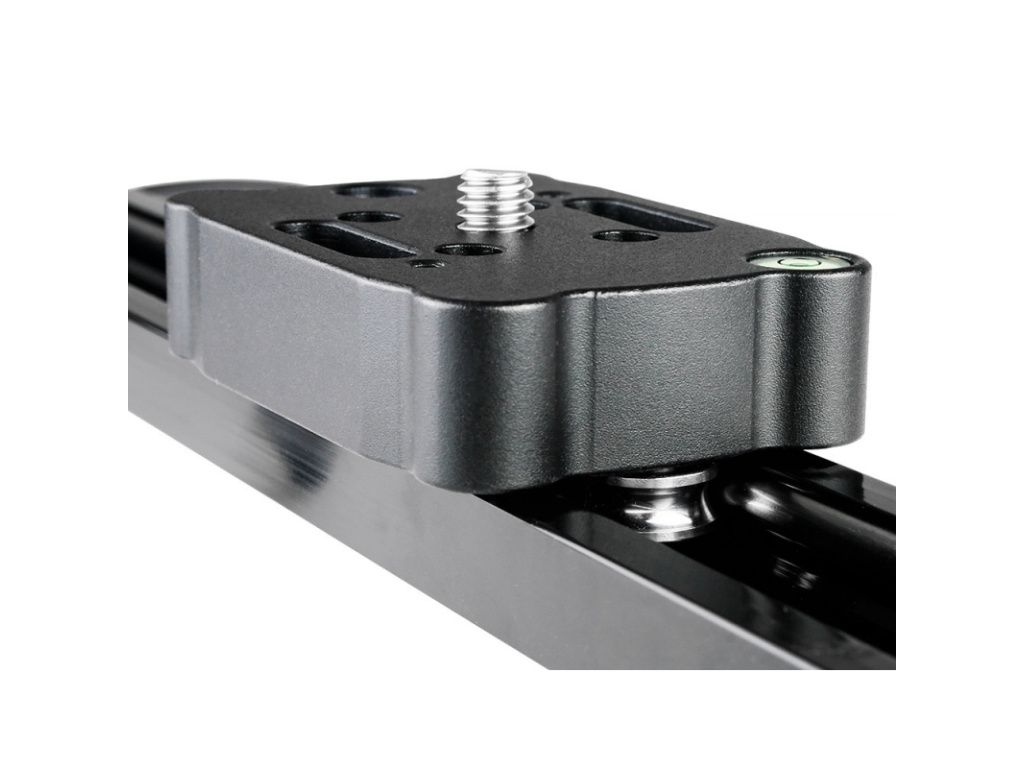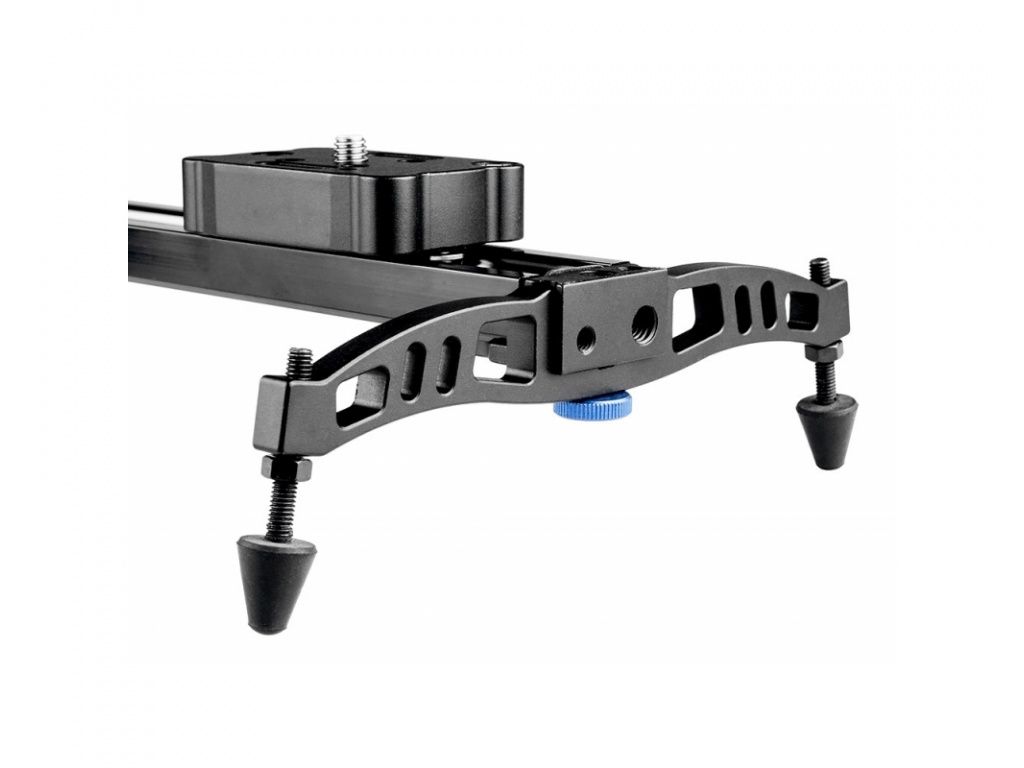 Szyna jest wykonana ze sztywnego aluminium. Slider zawiera gwinty montażowe (1/4 "i 3/8") na końcach i środku, dzięki czemu slider można wygodnie przymocować do statywu. Na końcach znajduje się również gwint do mocowania dołączonych nóżek. Nóżki można bez problemu zdjąć.
