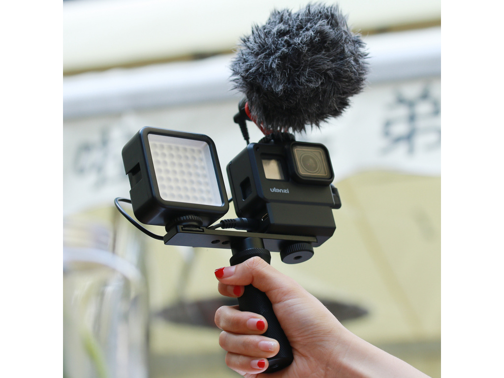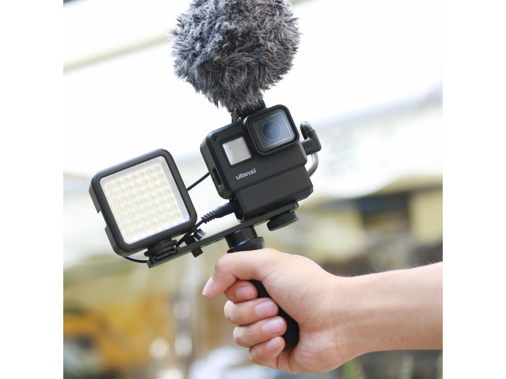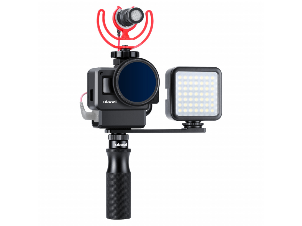 Uniwersalny uchwyt do różnych typów akcesoriów i kamer sportowych, wyposażony w jedno mocowanie "hot shoe" - sanki (męskie), w tym gwint 1/4" i blokadę, jedno "cold shoe" - sanki (żeńskie) i jedną śrubę 1/4" do szybkiego i bezpiecznego montażu akcesoriów zewnętrznych, takich jak: mikrofon, światło LED, rejestrator audio i inne wyposażenie. Dodatkowo środkowa część uchwytu zawiera pięć gwintów 1/4" do przymocowania uchwytu.