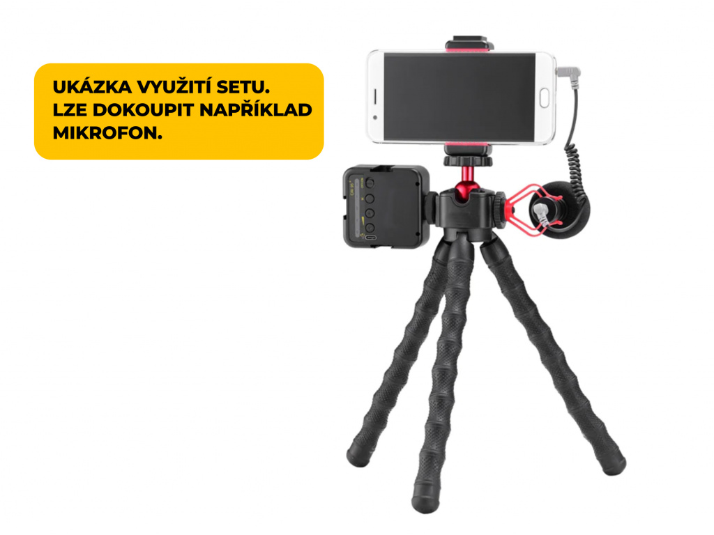 Bardzo bogaty zestaw dla reżyserów mobilnych. Zestaw zawiera statyw, który można łatwo przekształcić w uchwyt do selfie, mikrofon, lampę LED, zdalny spust migawki i sam uchwyt...