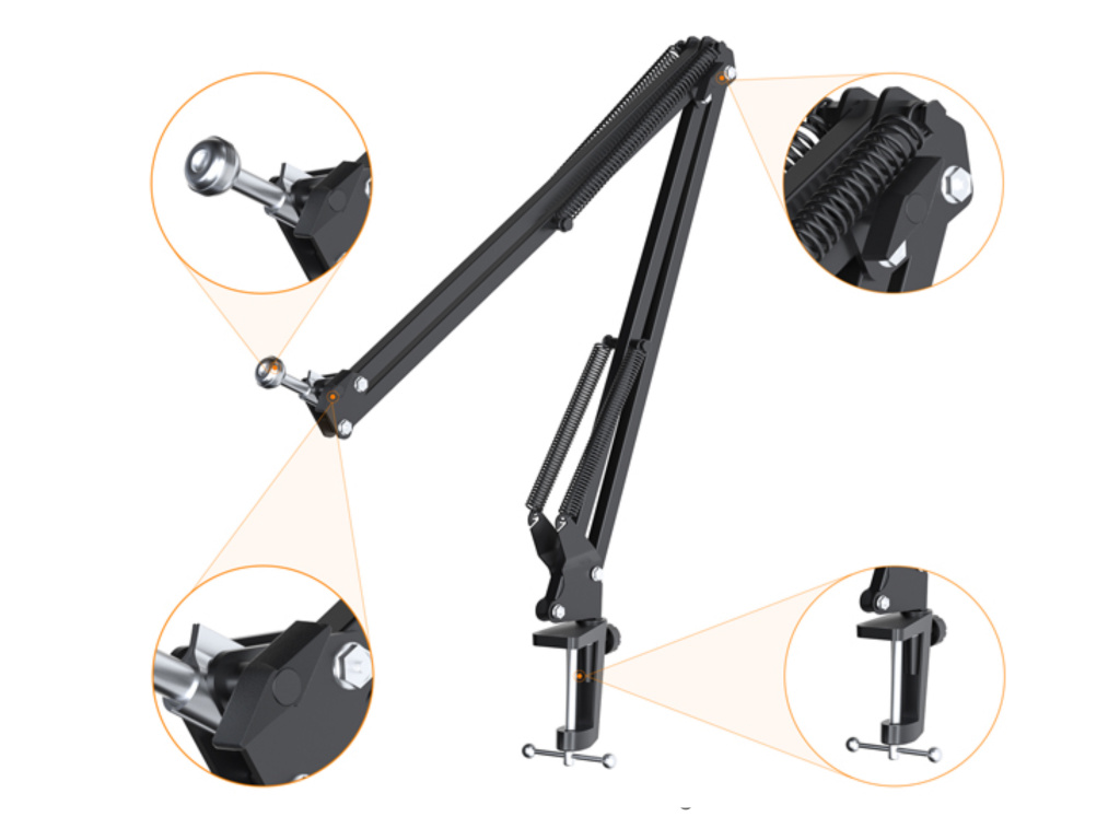 Ramię jest stabilne i praktyczne, kąty można precyzyjnie regulować zgodnie z wymaganiami różnych scen. Dzięki materiałom o wysokiej wytrzymałości z łatwością utrzyma ciężar mikrofonu bez poluzowania lub przesunięcia nawet po długim użytkowaniu - Wyposażony w statyw biurkowy do mikrofonu, elastyczna rozbudowa