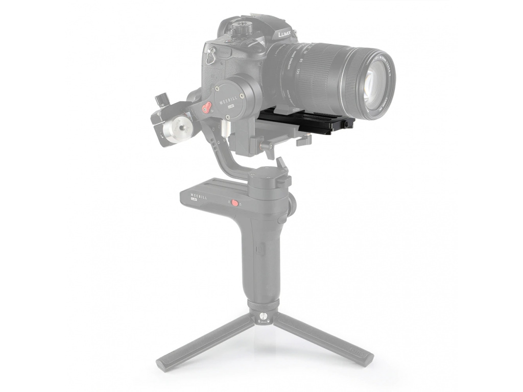 Zewnętrzna płytka SmallRig 2277 standardu Manfrotto ułatwiająca wyważenie gimbala Zhiyun Weebill i Crane 2. Płytki używa się zamiast standardowej płytki dołączonej do gimbala. Płytka zawiera osiem gwintów 1/4" do montażu obciążników, a po przeciwnej stronie znajduje się kolejny gwint 1/4" do montażu podpórki obiektywu lub uchwytu do bocznego ustawiania ostrości. Obciążników można użyć, jeśli spełniasz nośność gimbala, ale z powodu niestandardowego kształtu kamery lub zbyt długiego obiektywu nie możesz wyważyć gimbala. Jako przykład kamery, którą trudno było wyważyć na niektórych typach gimbali, może posłużyć kombinacja GH5 + SpeedBooster + Sigma Art 16-35 mm lub nowy BMPCC 4K (bez względu na obiektyw, ze względu na niestandardowy kształt kamery).