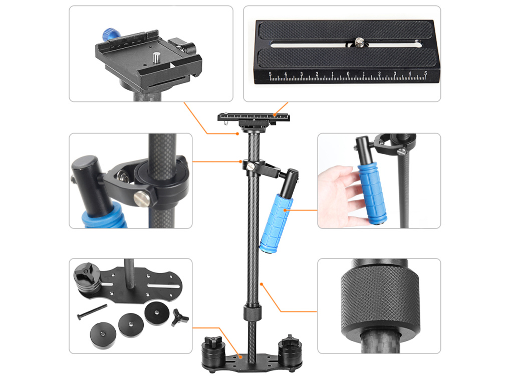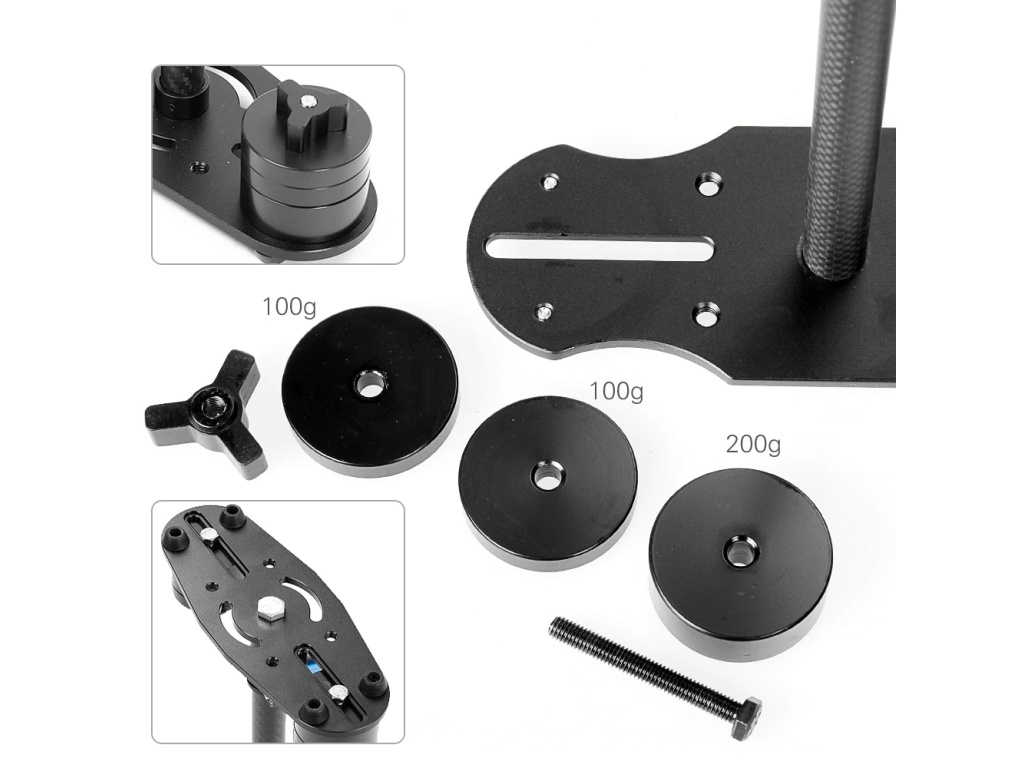S-60C ma wygodny, ergonomiczny uchwyt, który jest miękki i przyjemny w dotyku. Głowica jest regulowana w dwóch płaszczyznach. Zestaw zawiera 6 szt. obciążników o wadze 4x 100g i 2x 200g. Dobrze wyważony steadicam umożliwia wykonywanie zdjęć dotychczas znanych tylko z profesjonalnych filmów. Zwracamy uwagę, że prawidłowa równowaga jest podstawą do przyjemnej i komfortowej pracy z urządzeniem. Stabilizator z włókna węglowego waży zaledwie 1180g (bez obciążników).