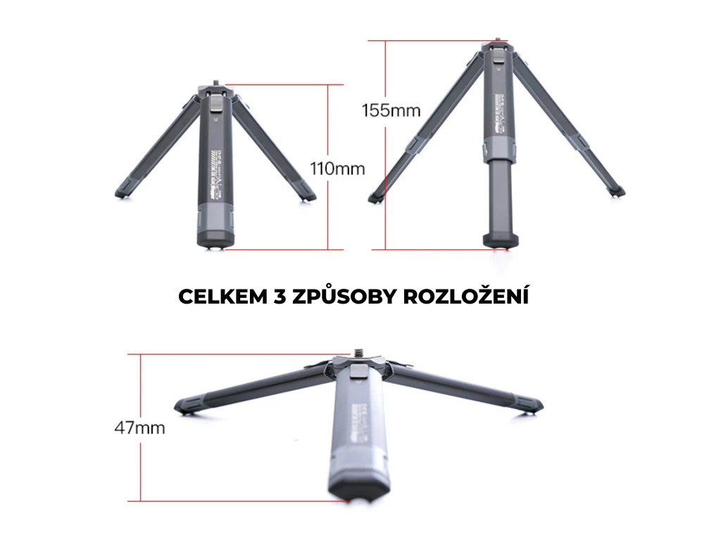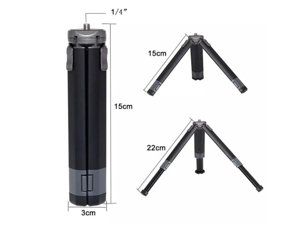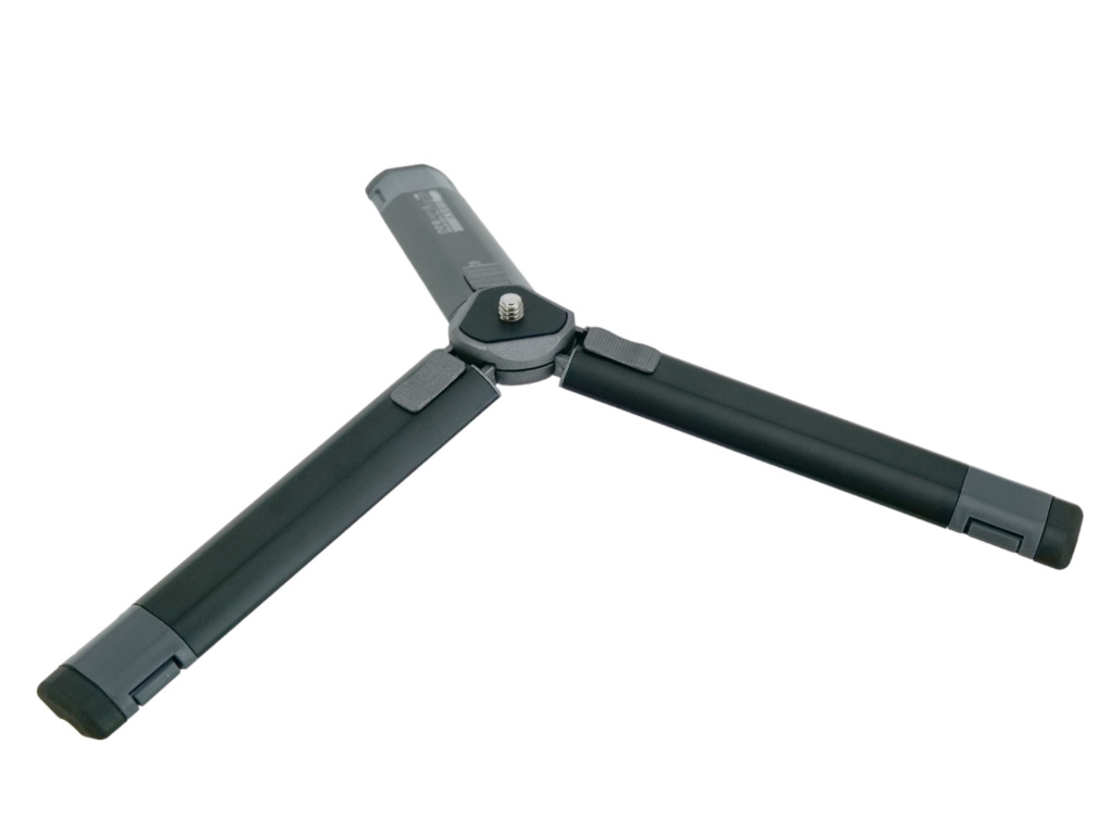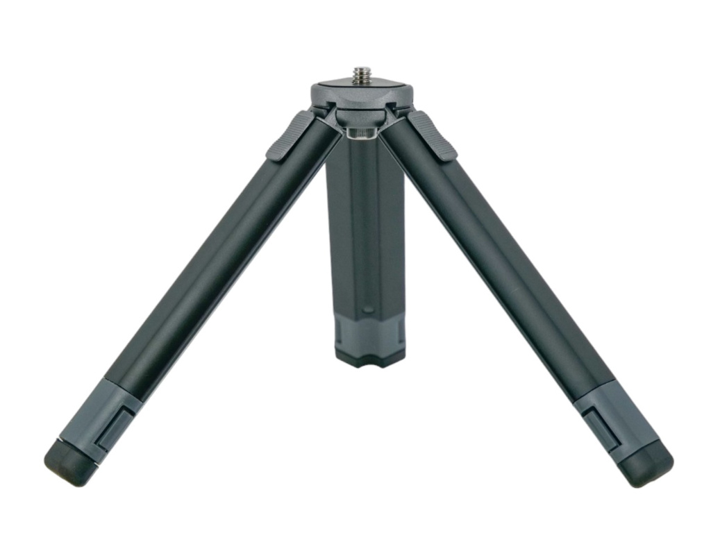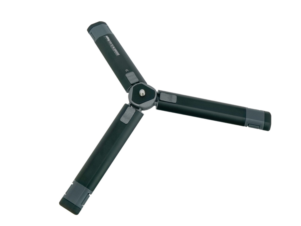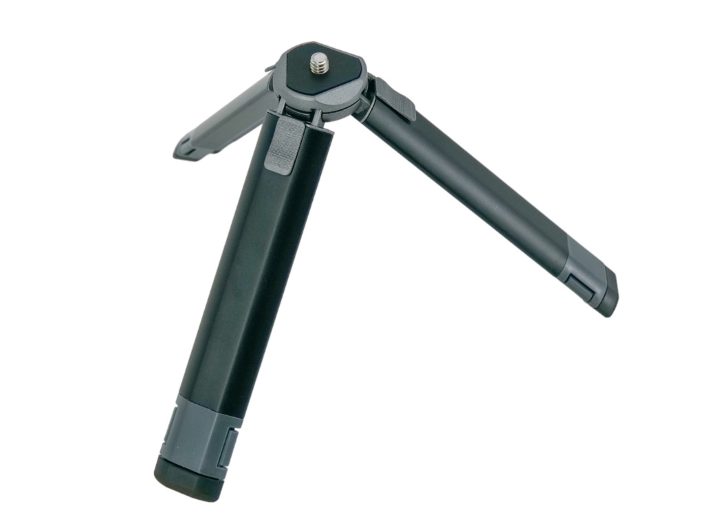 Wielofunkcyjny mini statyw ze standardową śrubą 1/4". Statyw można wykorzystać jako uchwyt do telefonu, podstawkę pod kamerę sportową lub jako statyw gimbalowy. Ergonomicznie ukształtowane nóżki zapewniają wygodny chwyt po złożeniu, dzięki czemu można go używać nawet jako uchwytu. Górna podstawa statywu jest gumowana, dzięki czemu nie porysujesz akcesoriów i nie będą się one ślizgać.