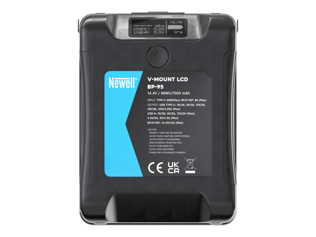 Newell BP-95 LCD V-Mount to rewolucyjny akumulator, który nie tylko wydłuża czas pracy aparatu lub kamery wideo. Dzięki pojemności 7000 mAh zapewnia długotrwałe zasilanie i może działać jako power bank. Za pomocą portów D-Tap, USB-C i USB-A można do niego podłączyć setki różnych urządzeń, w tym smartfony, laptopy lub ekrany podglądu. Moduł akumulatora jest kompatybilny z ładowarkami V-Mount i D-Tap. Można go również ładować za pomocą uniwersalnego portu USB-C. Oferuje ochronę przed przegrzaniem, przeładowaniem i nadmiernym rozładowaniem dla bezpiecznego użytkowania. Podświetlany wyświetlacz LCD pokazuje poziom naładowania, napięcie przesyłane do urządzeń oraz pozostały czas pracy.