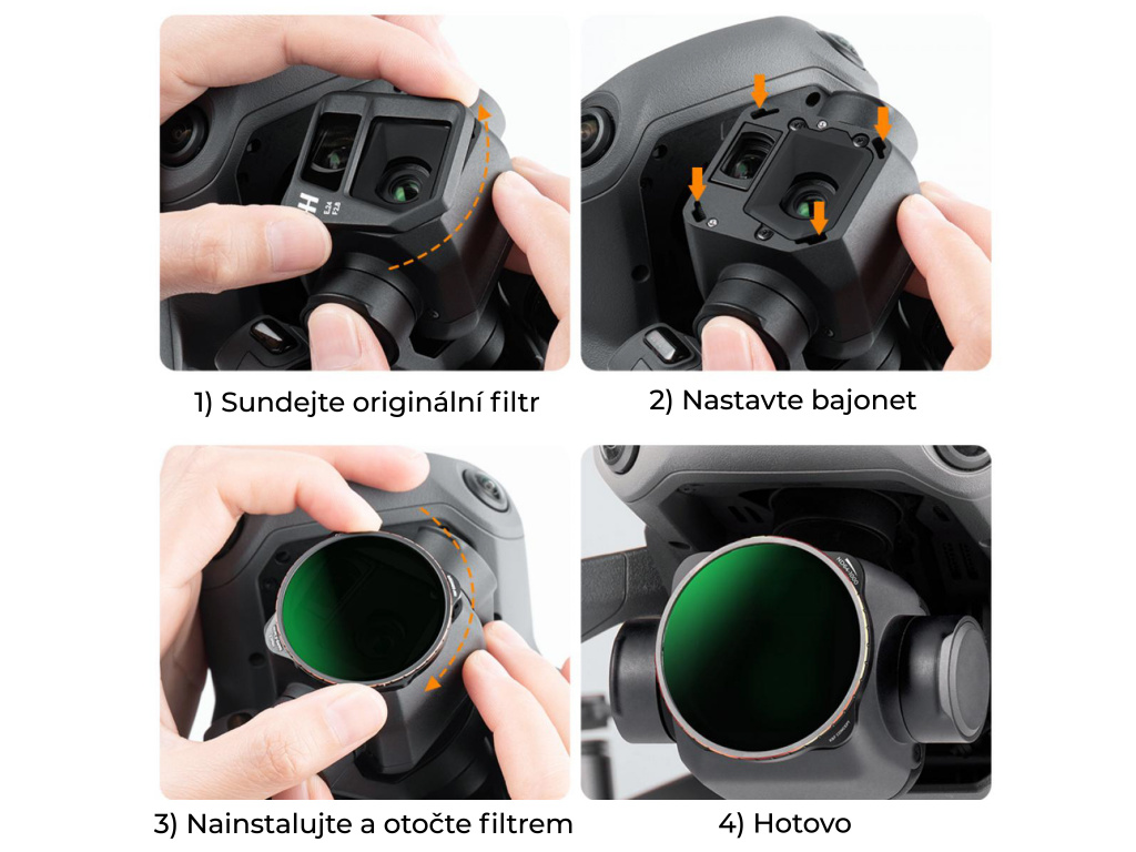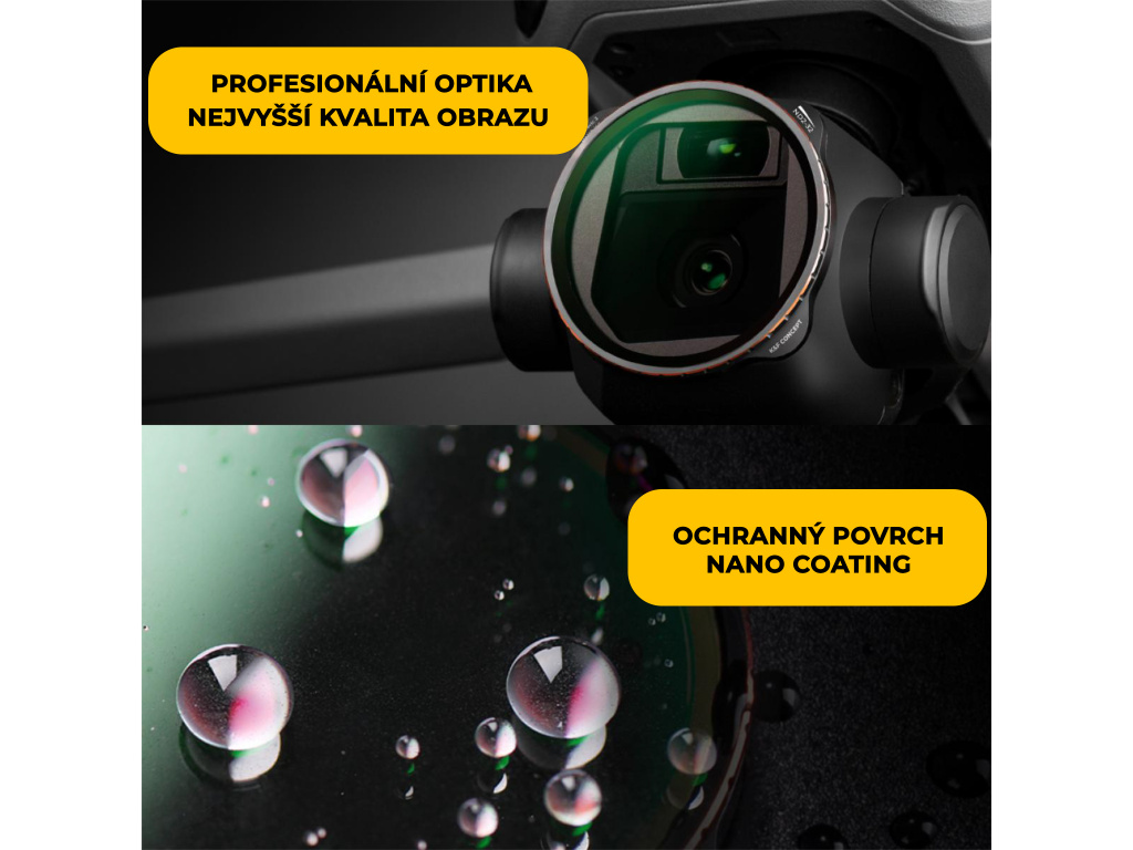 Filtry s proměnnou neutrální vrstvou ND2-ND32 určené ke zpomalení rychlosti závěrky fotoaparátu (zvyšuje plynulost pohybu, snižuje nežádoucí trhání). Filtr slouží pro snížení množství světla dopadajícího do snímače DJI Mavic kamery, má nastavitelné 1-5 stop clony, což vám umožní zachytit požadovaný přirozený efekt ve vašich záběrech (vyšší číslo znamená vyšší ztmavení).