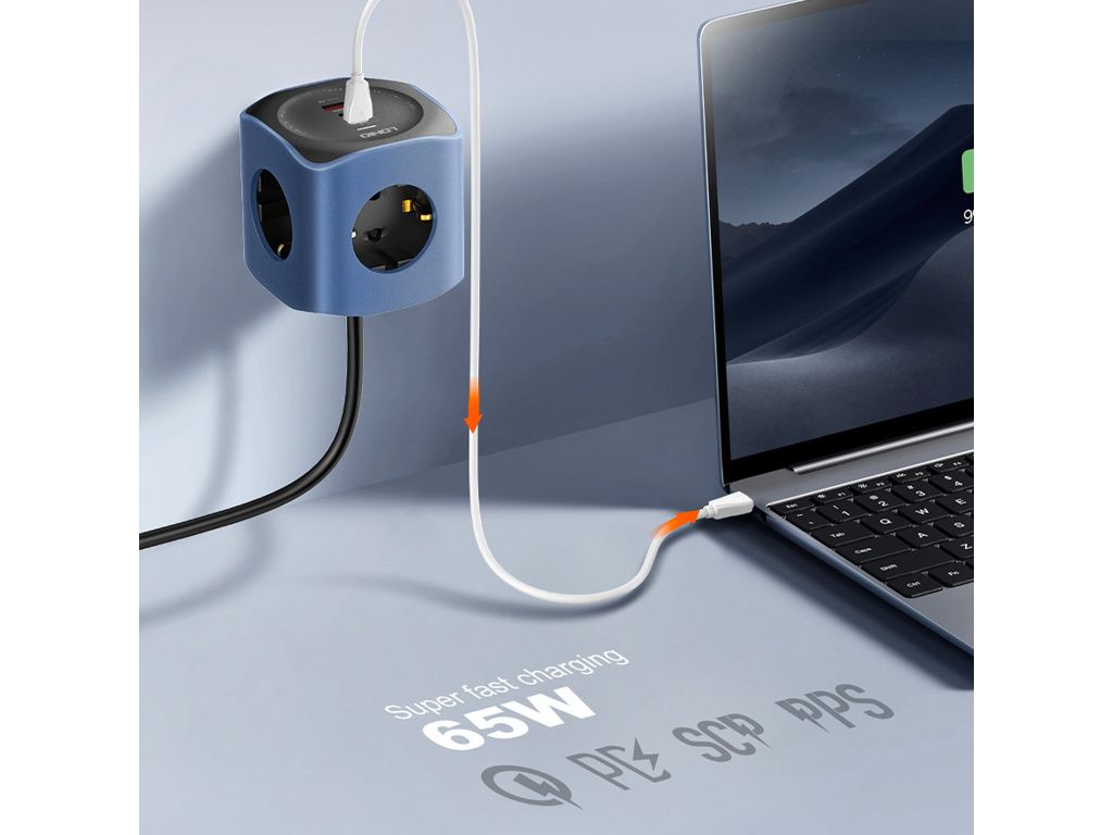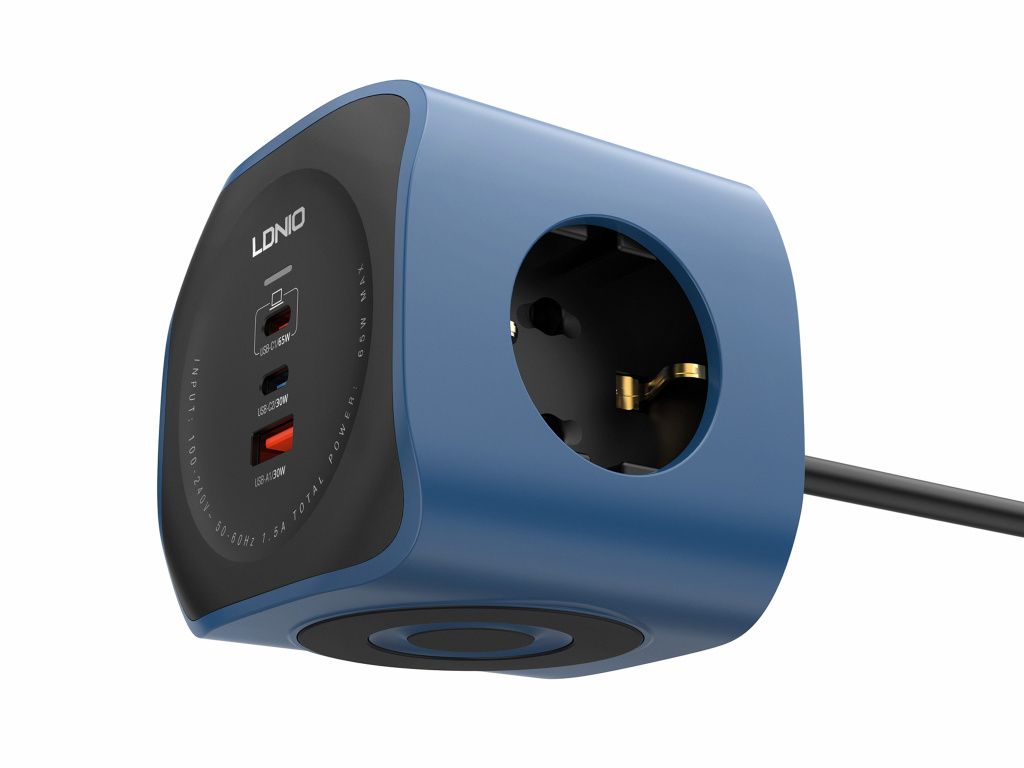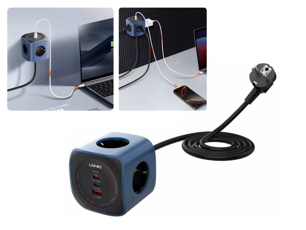 LDNIO SE3338 65W stolní napájecí adaptér se 3× EU zásuvkou, 2× USB-C a 1× USB-A. Rychlé nabíjení až 65 W s podporou moderních protokolů, 2m kabel a ohnivzdorné tělo. Ideální pro domácnost i kancelář.
