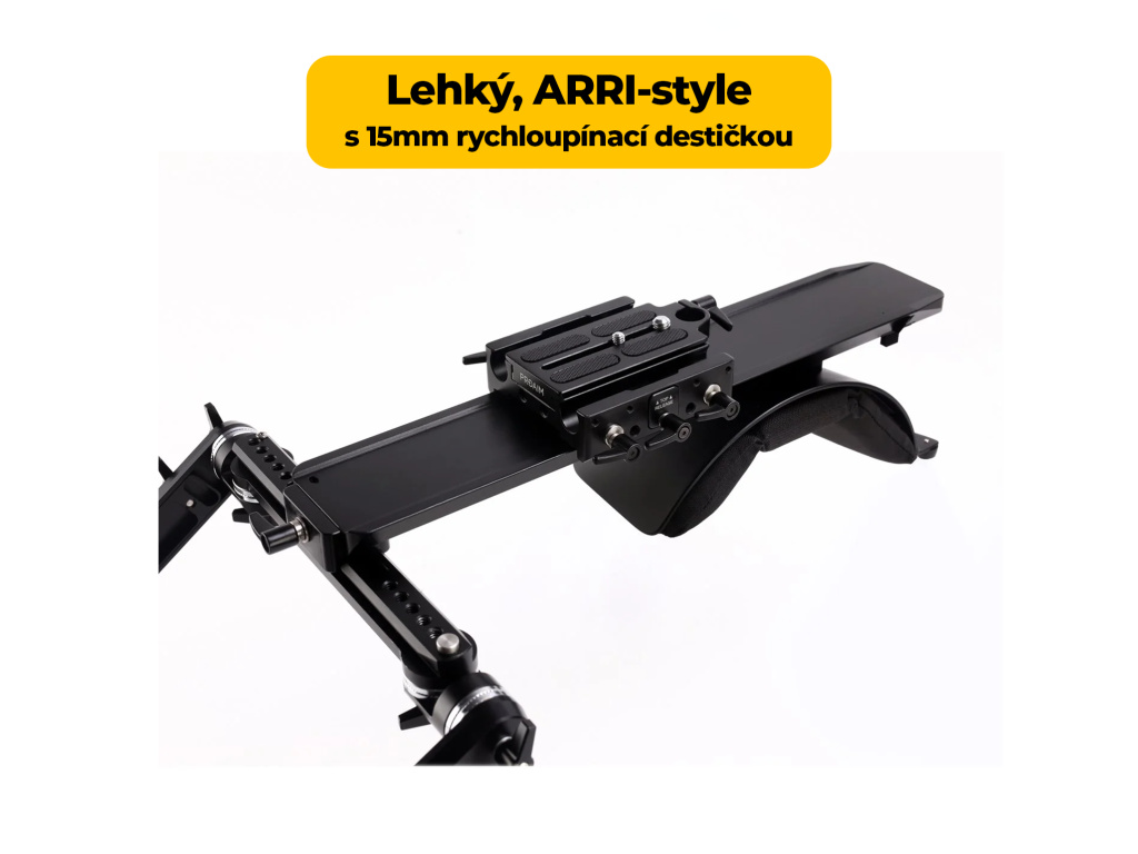 Základní deska obsahuje 15mm uchycení tyče pro připojení kompatibilního příslušenství.Základní deska také umožňuje okamžité přepnutí nastavení fotoaparátu z ramenní soupravy na stativ.