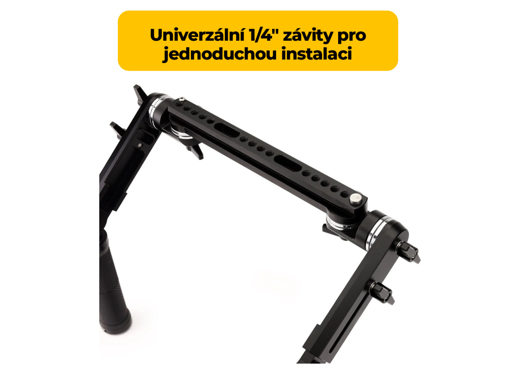 Hmotnost integrovaného monitoru, držáku baterie nebo jiného příslušenství lze lépe vyvážit přenesením z fotoaparátu na samotný držák na rameno pomocí závitů 1/4"-20 na příčníku.