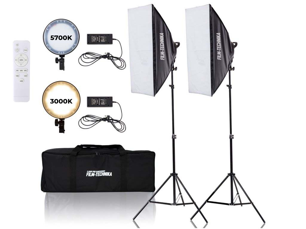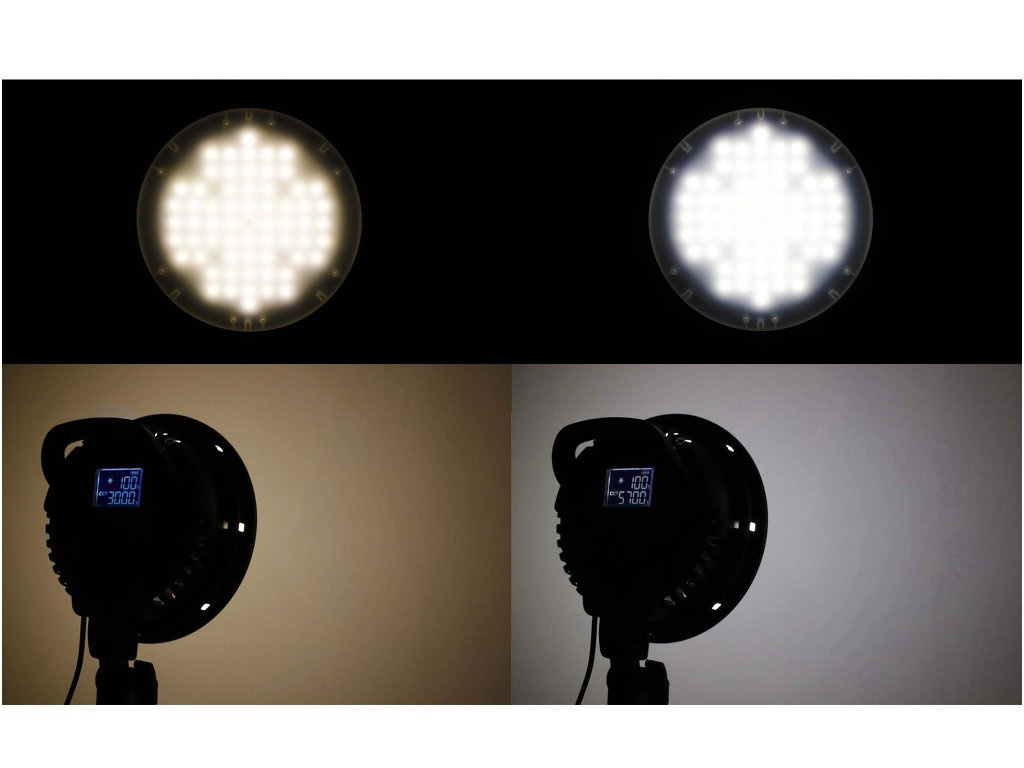 | Regulácia intenzity svetla a teploty Softbox s možnosťou regulácie intenzity svetla pomocou otočného kolieska a tiež s možnosťou zmeny teploty z 5700 K na 3000 K pomocou otočného kolieska (novinka). Výhodou tejto sady je jednoznačne rozšírená možnosť zmeny svietivosti. Keď fotografujete alebo filmujete zblízka, potrebujete menší výkon, ktorý toto svetlo ľahko poskytne. V prípade žiarovkových softboxov je potrebné regulovať intenzitu svetla výmenou žiarovky alebo premiestnením softboxov, čo nie je vždy možné z dôvodu nedostatku miesta. |