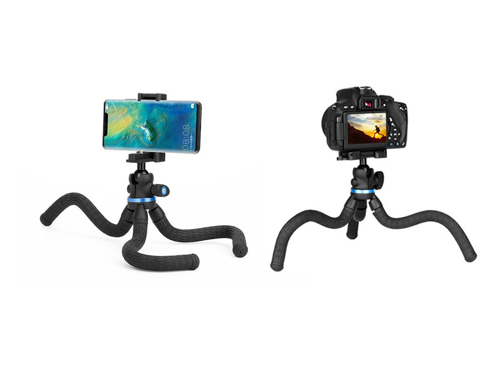 Statív "chobotnica" je ideálny na rýchle, neplánované statické zábery. Neexistujú žiadne obmedzenia, môže sa použiť na upevnenie na strom, bicykel, zrkadlo auta alebo na parapet - záleží len na vašej kreativite. Dôležité je spomenúť, že statív nie je na prvý pohľad nijako zvlášť zaujímavý, ale každý, kto si ho v našom obchode všimol, sa naň okamžite opýtal. Tvar je ideálny a po ľahkom "ohmataní" je zrejmé, že ide o veľmi pevný výrobok za rozumné peniaze. Statív má nosnosť 2 kg a je vhodný pre fotoaparáty aj smartfóny. Veľkou výhodou je guľová hlava, ktorá umožňuje bezproblémové polohovanie a otáčanie o 360°. Fotoaparát sa upevňuje pomocou štandardného 1/4", ale platformu možno sklopiť a použiť na upevnenie smartfónu s priemerom od 58 mm do 83 mm.