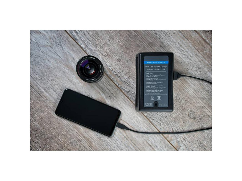 Batéria V-Mount má kapacitu(10400 mAh), ako aj možnosť pripojenia cez USB alebo D-Tap. Všetko potrebné príslušenstvo možno nabíjať cez USB a väčšinu fotoaparátov možno napájať cez D-Tap. Preto nie je pravidlom, že sa baterka používa len s nástavcom V-Mount.