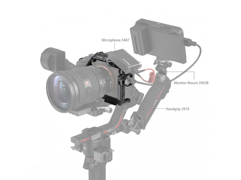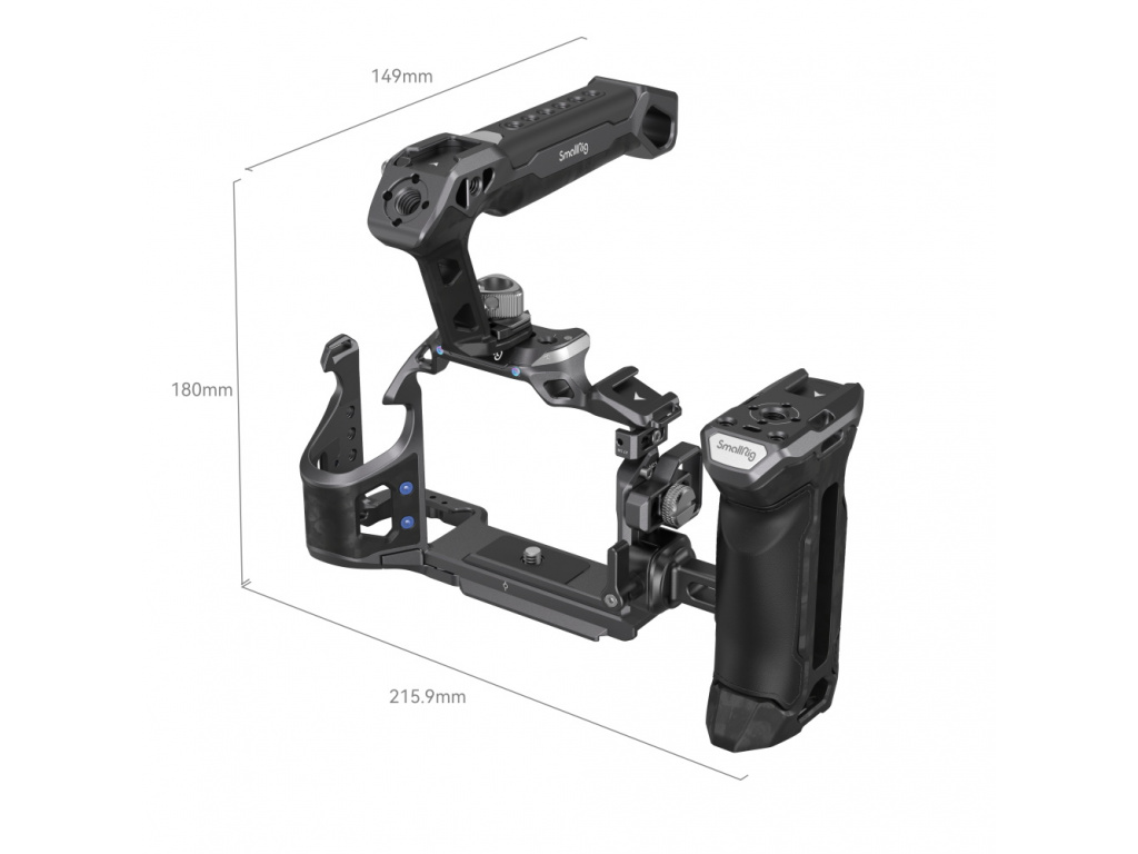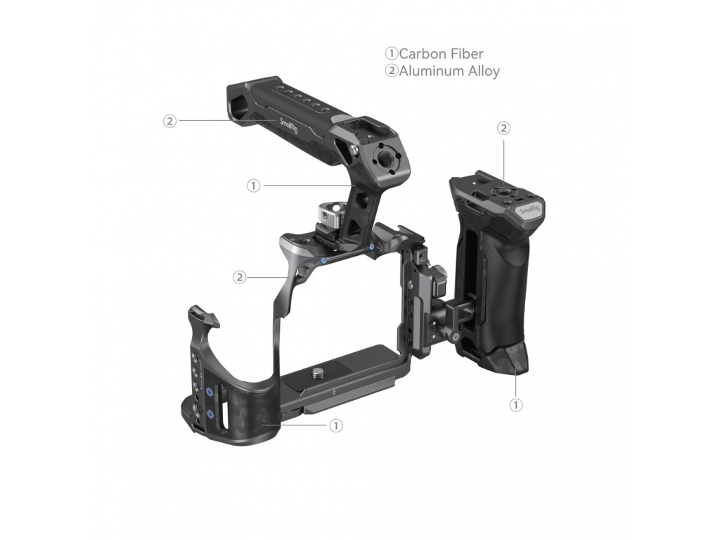 Súprava obsahuje klietku, hornú rukoväť, bočnú rukoväť a svorku na kábel HDMI. Klietka a dve rukoväte sú prenosné, pretože sú vyrobené z ľahších uhlíkových vlákien, takže streľba z ruky je dlhšia. Klietka, polohovací kolík, skrutka 1/4"-20 a skrutka M2,5 spoločne pevne zaistia fotoaparát. Má čistý aerodynamický dizajn, ktorý umožňuje úplný prístup k horným tlačidlám. Horná rukoväť je pohodlná na prenášanie a natáčanie pod uhlom Bočná rukoväť, vyrobená z ľahkých uhlíkových vlákien a PU kože, umožňuje pohodlné a pevné uchopenie a svorka kábla HDMI, utiahnutá skrutkou s plochou hlavou, chráni rozhranie a zabezpečuje stabilitu Prenos signálu Súprava obsahuje aj otvory so závitom 1/4"-20 pre Magické rameno 3873 , držiaky mikrofónov, LED video svetlo a polohovacie otvory ARRI 3/8"-16 pre bočnú rukoväť 2914. Koľajnica NATO a rýchloupínacia doštička Arca-Swiss zvyšujú univerzálnosť klietky Najmä doštička Arca-Swiss umožňuje rýchle prepínanie medzi režimami ručného držania, statívu a gimbaluDJI RS 2 / RSC 2 / RS 3 / RS 3 Pro). .