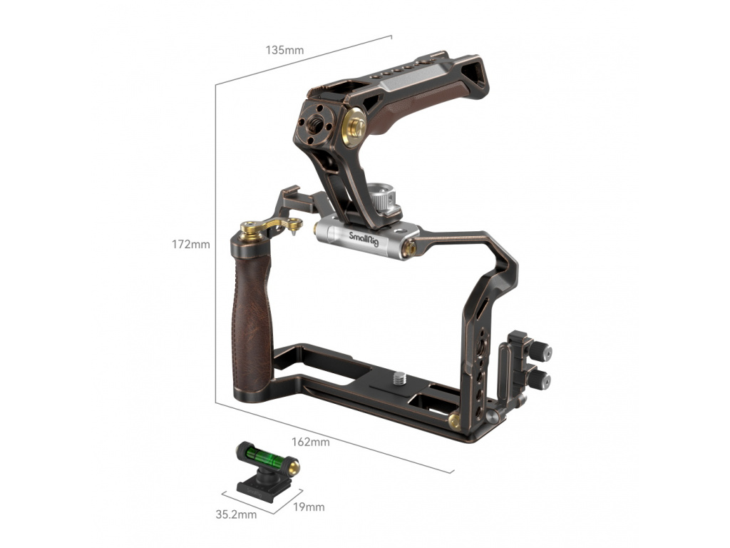 Súprava SmallRig Retro Handheld Cage Kit pre fotoaparát FUJIFILM X-T5 3872 je navrhnutá tak, aby uľahčovala snímanie z nízkeho uhla, chránila fotoaparát a poskytovala montážne body pre príslušenstvo. Súprava obsahuje klietku, hornú rukoväť, svorku na káble HDMI a USB-C a kryt saní. Klietka je vybavená novým punkovým štýlom s rámom adaptéra tlačidla uzávierky a ergonomickým koženým gripom pre lepšie ovládanie uzávierky a lepší úchop. Body na upevnenie príslušenstva zahŕňajú: závitový otvor 1/4"-20, závitový otvor 3/8"-16", axiálny otvor ARRI 3/8"-16, držiak studenej pätice, lištu NATO, vhodné pre magické rameno, bočnú rukoväť, hornú rukoväť, svorku na tyč, základnú dosku, LED video svetlo, mikrofón atď. Svorka kábla HDMI a USB-C s novým dizajnom push-and-flip umožňuje jednoduchý prístup ku krytu rozhrania fotoaparátu a zároveň zabraňuje náhodnému odpojeniu a zabezpečuje stabilný prenos signálu. Ergonomická horná rukoväť umožňuje pohodlné a stabilné snímanie pod nízkym uhlom. Okrem toho je v kryte hot shoe bublina na kalibráciu.