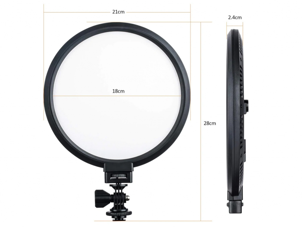 Svetlo je veľmi mäkké, rozmerovo ideálne na montáž na fotoaparát, nie príliš veľké. Má priemer 21 cm. Svetlo je vybavené závesom, ktorý sa dá polohovať hore/dole a celé svetlo sa dá umiestniť do sánok na fotoaparát. Na zadnej strane sa nachádza displej, na ktorom vidíte aktuálne nastavenie svetla. Pomocou otočného gombíka potom môžete meniť teplotu v krokoch po 100 K od 3300 K do 5600 K. Ak chcete svetlo napájať zo siete, potrebujete adaptér 8V-15V s konektorom Ф5,5*2,0 mm.