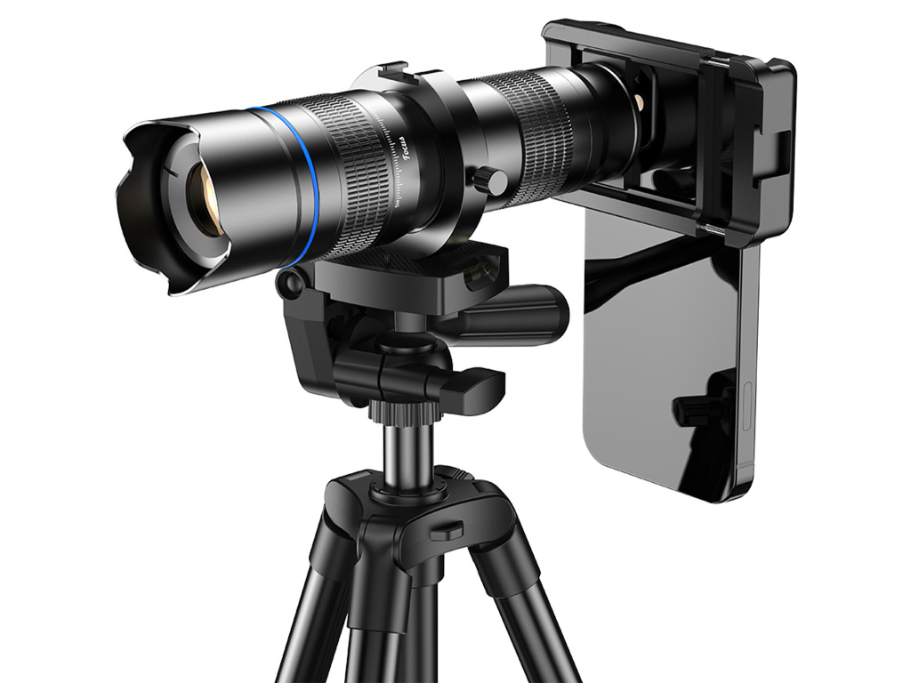 Objektív smartfónu s možnosťou 20-násobného až 40-násobného priblíženia skutočného obrazu. Obsahuje statív a neoprénové puzdro.