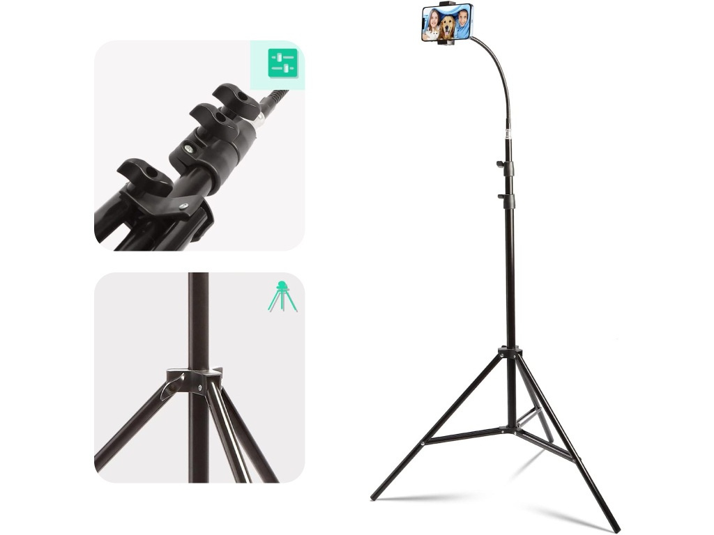Tento robustný a ľahký statív s maximálnou výškou 2,1 m (82,7 palcov) je ideálny na vlogovanie, živé vysielanie, videohovory alebo zhotovovanie fotografií. Vďaka flexibilnému husiemu krku s dĺžkou 50 cm ľahko nastavíte požadovaný uhol. Univerzálny držiak je kompatibilný so smartfónmi so šírkou 5,5 – 9 cm a jeho silikónové podložky chránia zariadenie pred poškriabaním. Statív je vybavený 1/4" závitom, ktorý umožňuje pripevnenie širokej škály zariadení, ako sú fotoaparáty, kamery alebo svetlá.