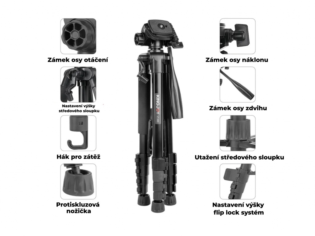 Kingjoy VT-990 je multifunkčný statív s maximálnou výškou 168 cm. Možno ho použiť pre smartfón, fotoaparát, kameru alebo iné zariadenia so závitom 1/4". Má nosnosť 2 až 5 kg a na začiatok vám postačí.