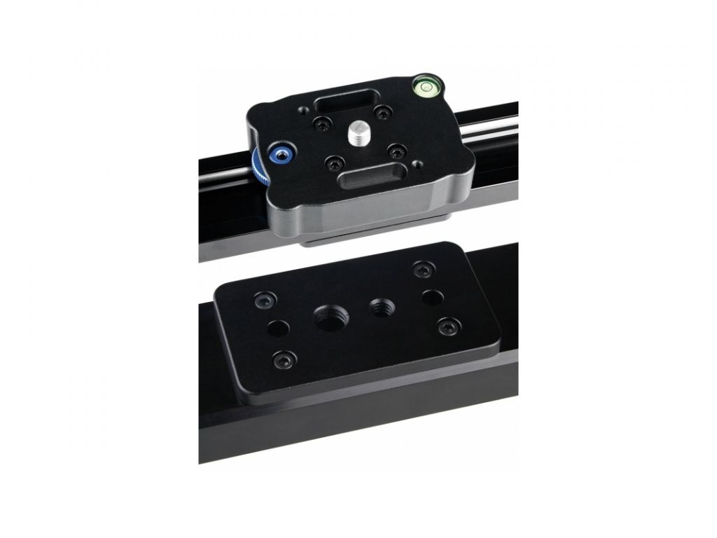 Kolejnice je vyrobena z tuhého hliníku. Slider obsahuje montážní závity (1/4 "a 3/8") na koncích a středu lze tedy slider pohodlně připevnit na stativ. Na koncích je dále závit pro nasazení přiložených nožíček. Nožičky je možné bez problému sundat.