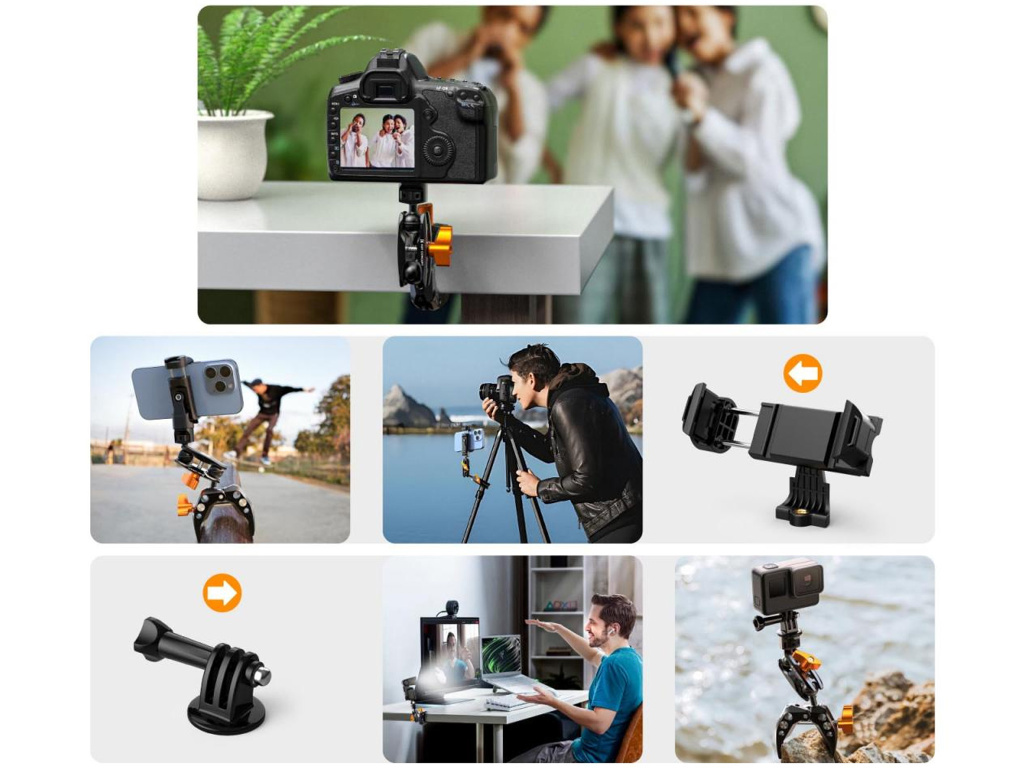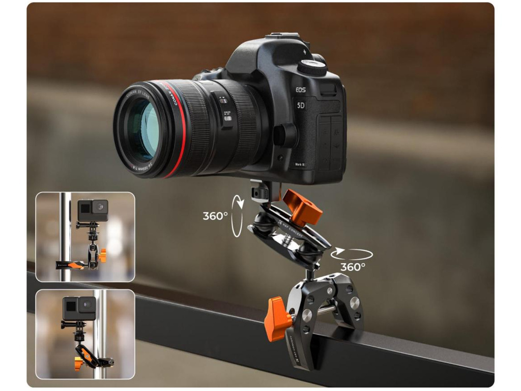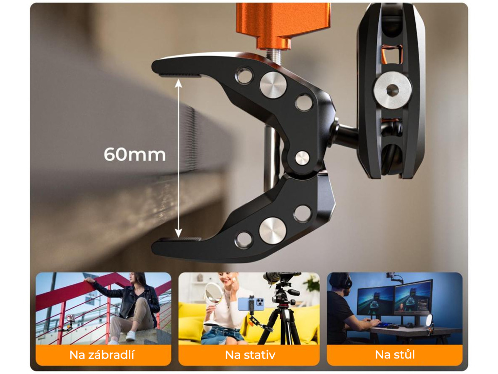KF Concept Multifunkční svorka s kulovým ramenem s nosností 5 kg a čelistí až 60 mm nabízí snadné upevnění na různé povrchy, jako jsou zábradlí, stoly či trubky. S mnoha 1/4" závity umožňuje připojení adaptérů a magických ramen pro flexibilní nastavení úhlů. Magické rameno s dvojitými hlavami a Arri šroubem zajišťuje pevné uchycení kamer, světel a dalšího vybavení, které zůstane stabilní během instalace. Rameno podporuje rotaci pro kreativní záběry, a díky oddělené konstrukci lze jednotlivé komponenty použít samostatně nebo společně pro maximální flexibilitu.
